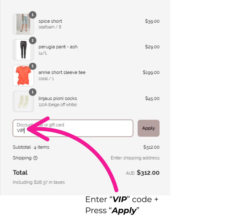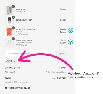 Just remember, VIP discounts apply to full-priced items only, no exceptions.