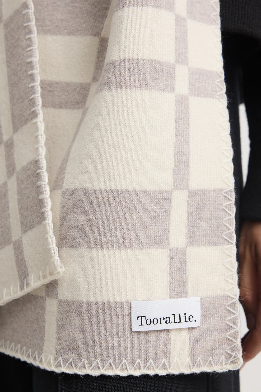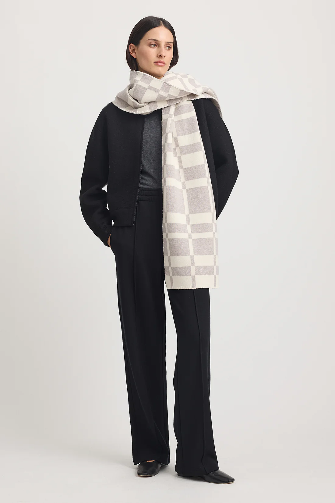The Toorallie Abstract Check Scarf is crafted from thick, luxurious Australian Merino Lambswool and features a bold dual-colour geometric pattern. Finished with a blanket stitch edge for a refined touch, this generously sized scarf (38 x 190cm) is the perfect blend of warmth, texture, and contemporary style.