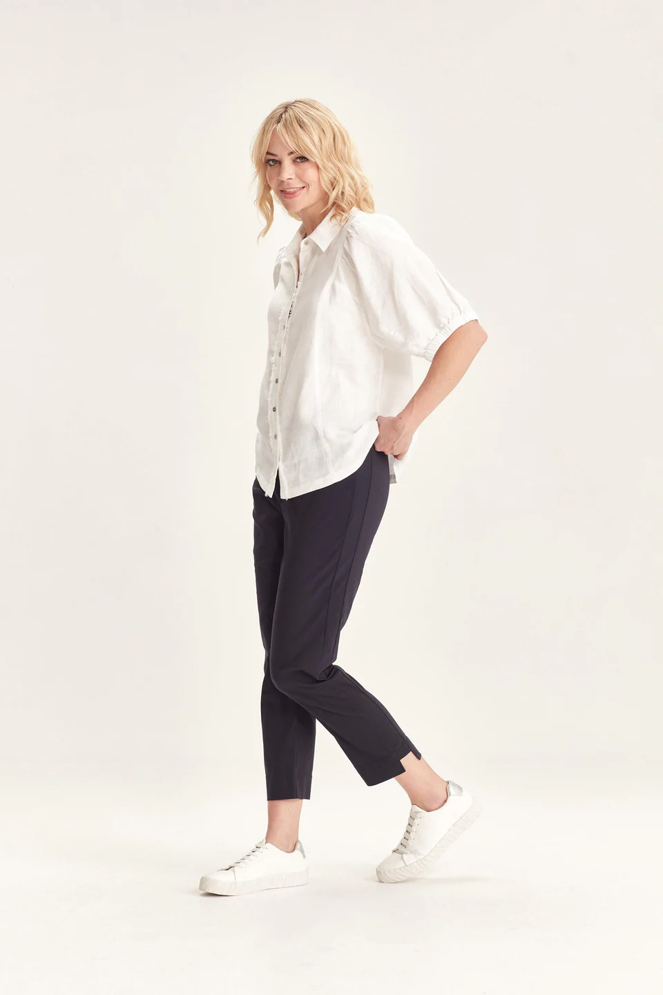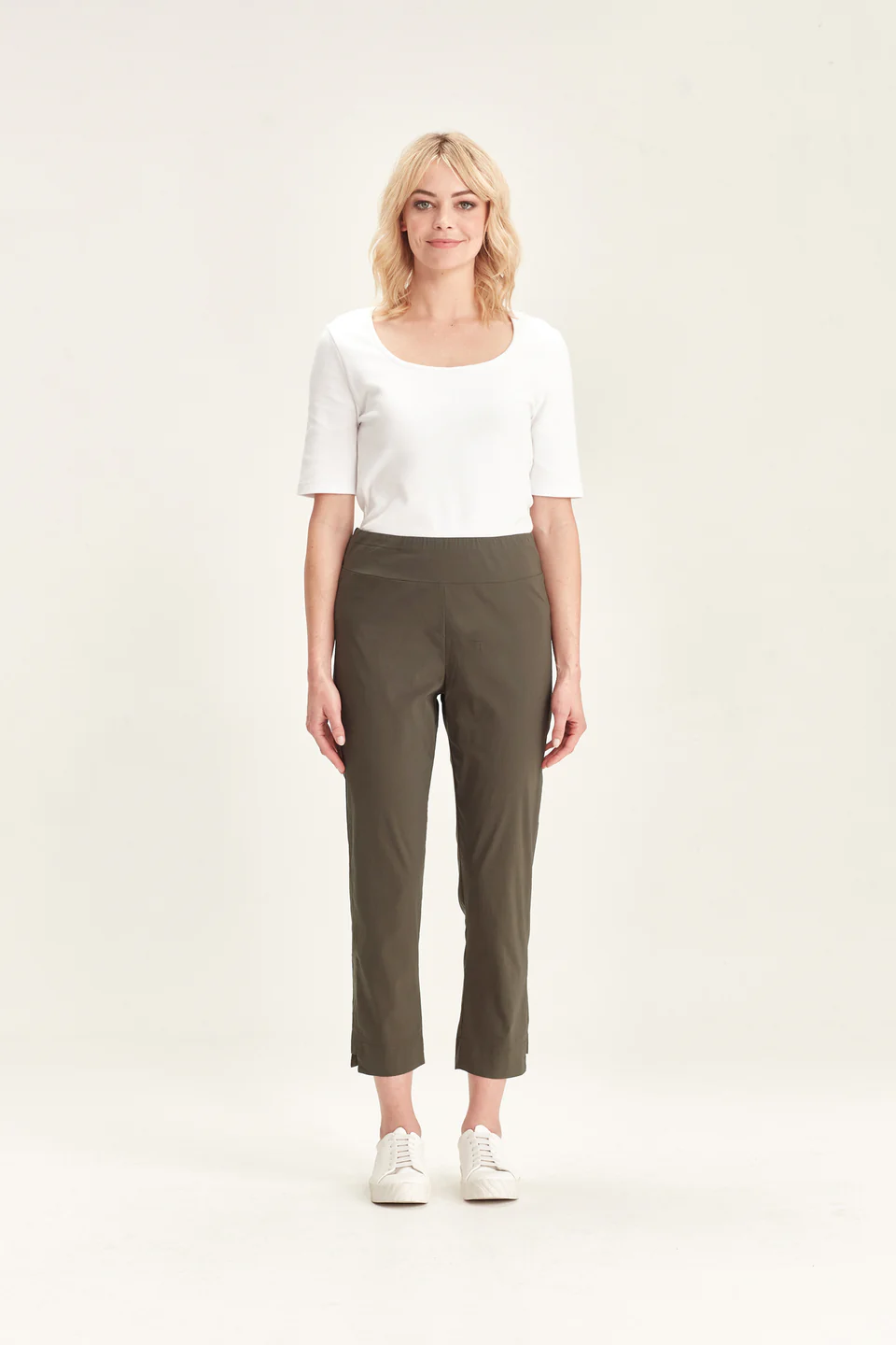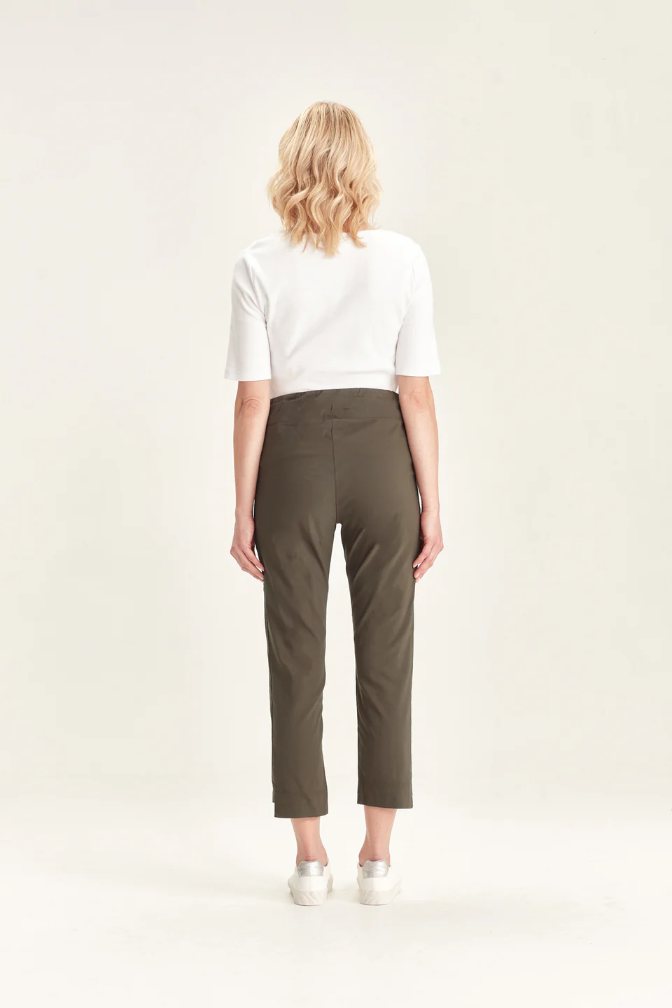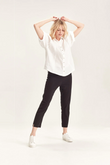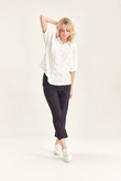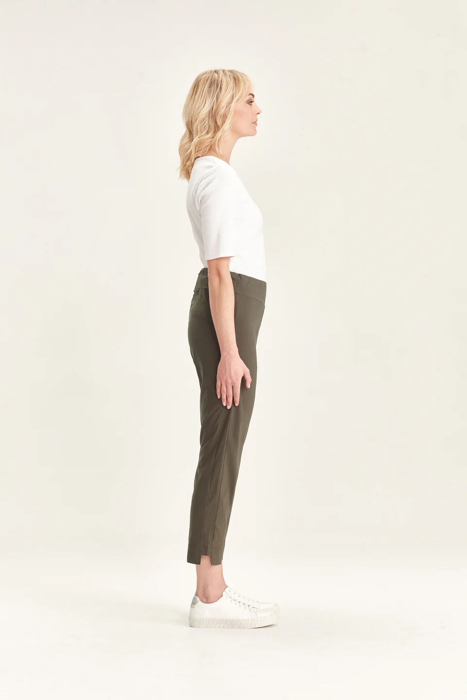 Crafted from VERGE's exclusive European lightweight stretch Cotton Acrobat fabric, the 7/8 length slim leg Desiree Pant offers exceptional comfort, breathability, and easy care. This stylish pant features a stepped hem, panel detailing down the sides, and a concealed elasticized waistband for a sleek, comfortable fit.