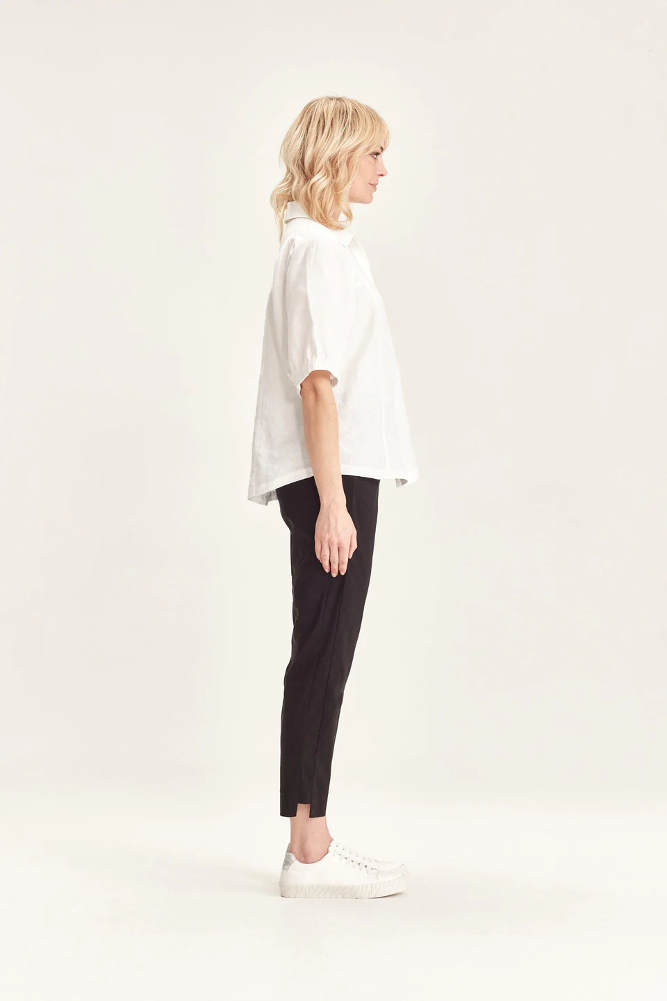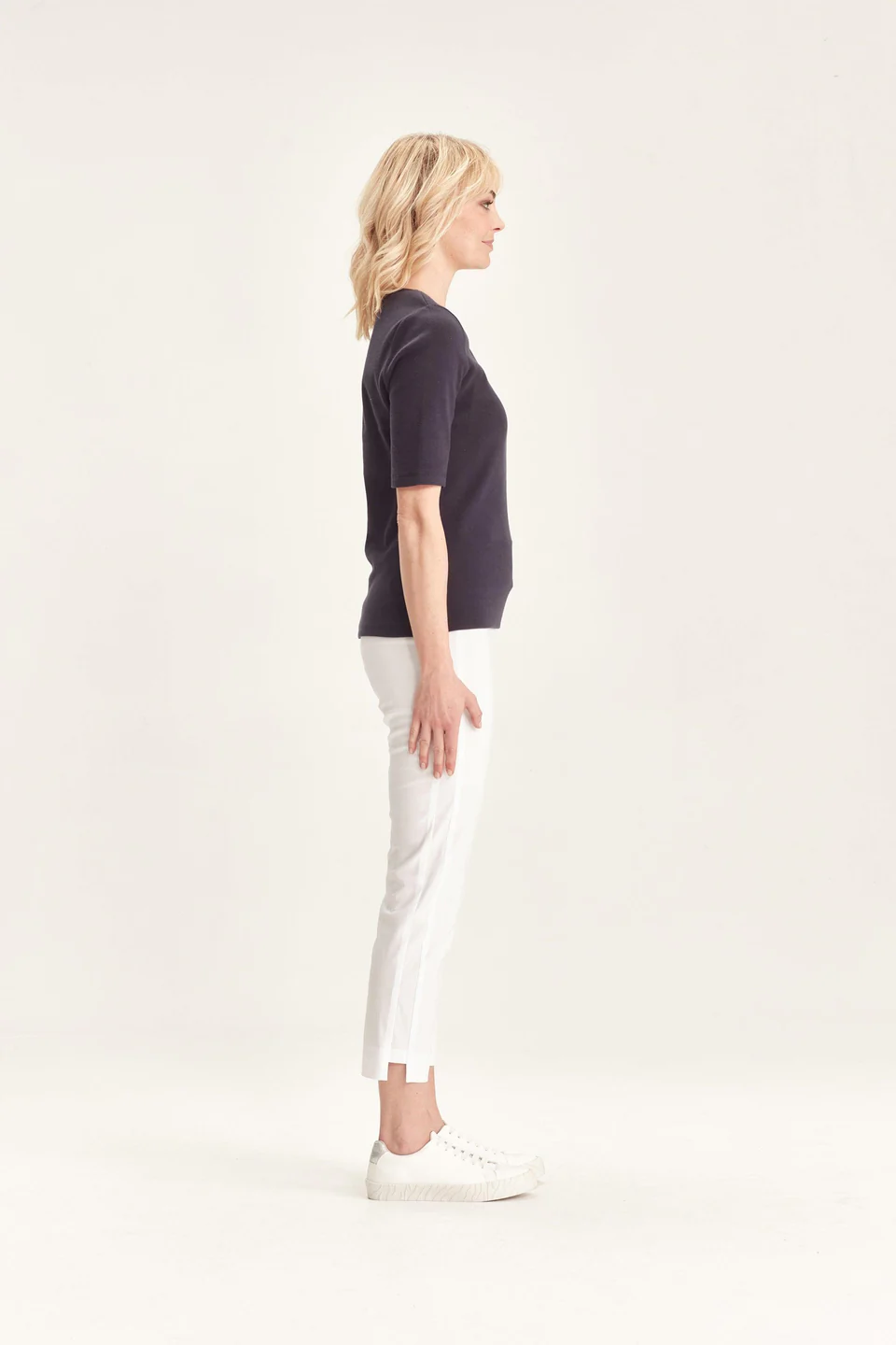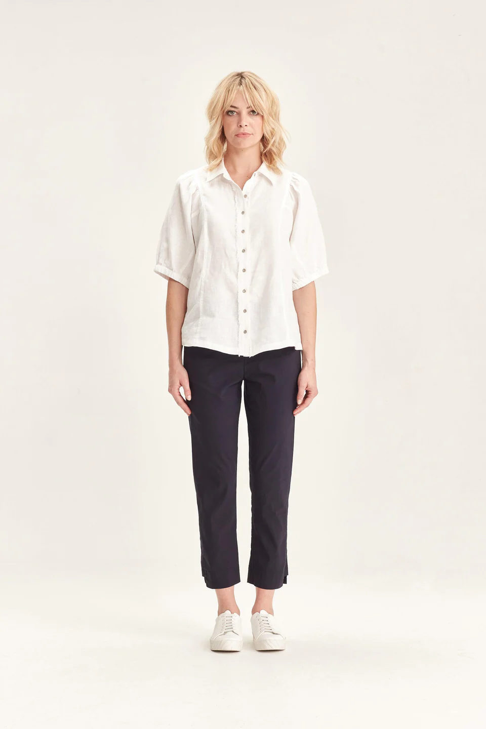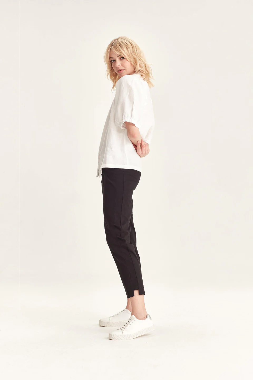 Crafted from VERGE's exclusive European lightweight stretch Cotton Acrobat fabric, the 7/8 length slim leg Desiree Pant offers exceptional comfort, breathability, and easy care. This stylish pant features a stepped hem, panel detailing down the sides, and a concealed elasticized waistband for a sleek, comfortable fit.
