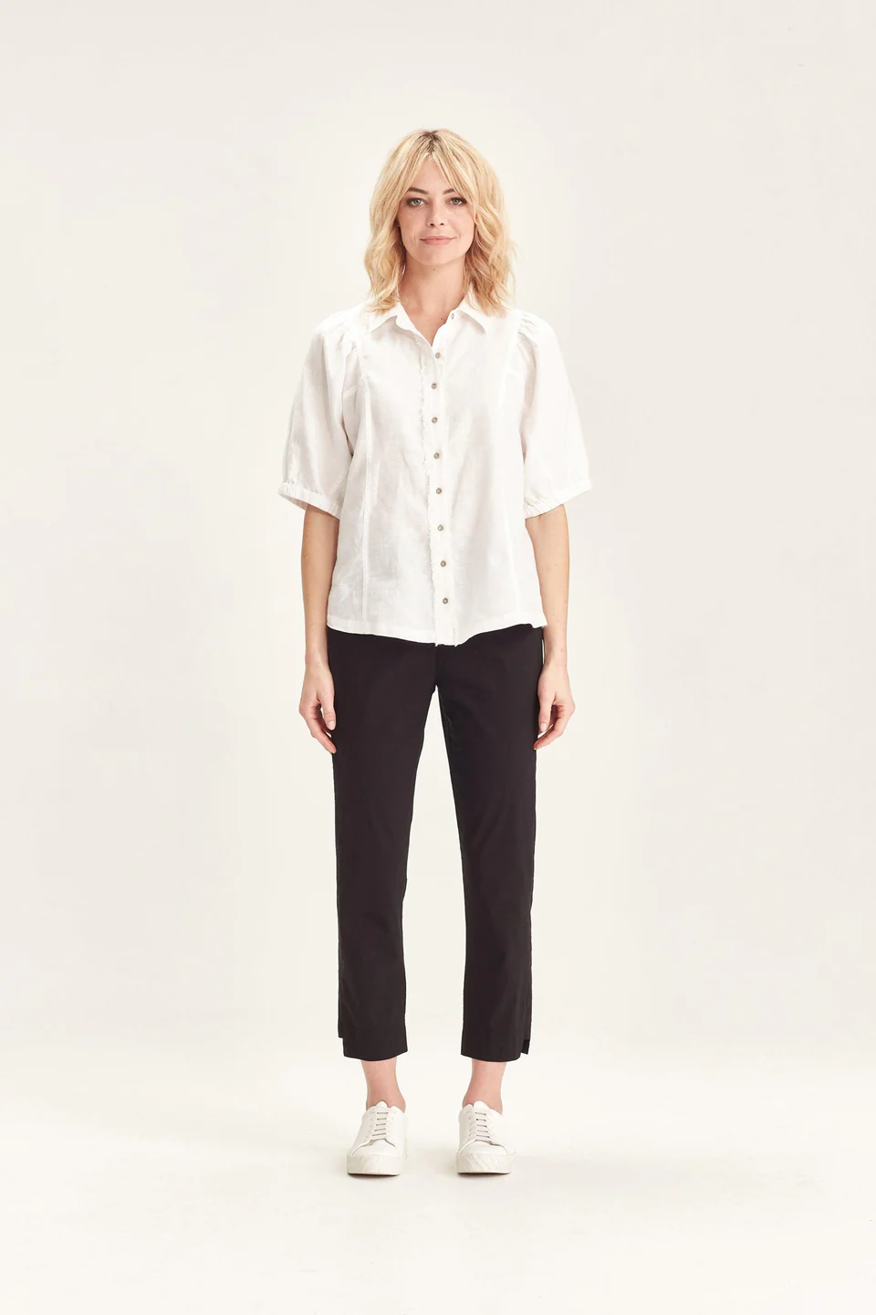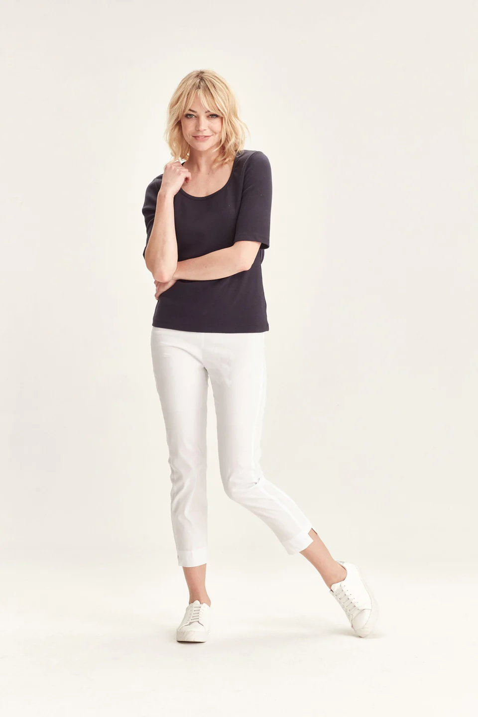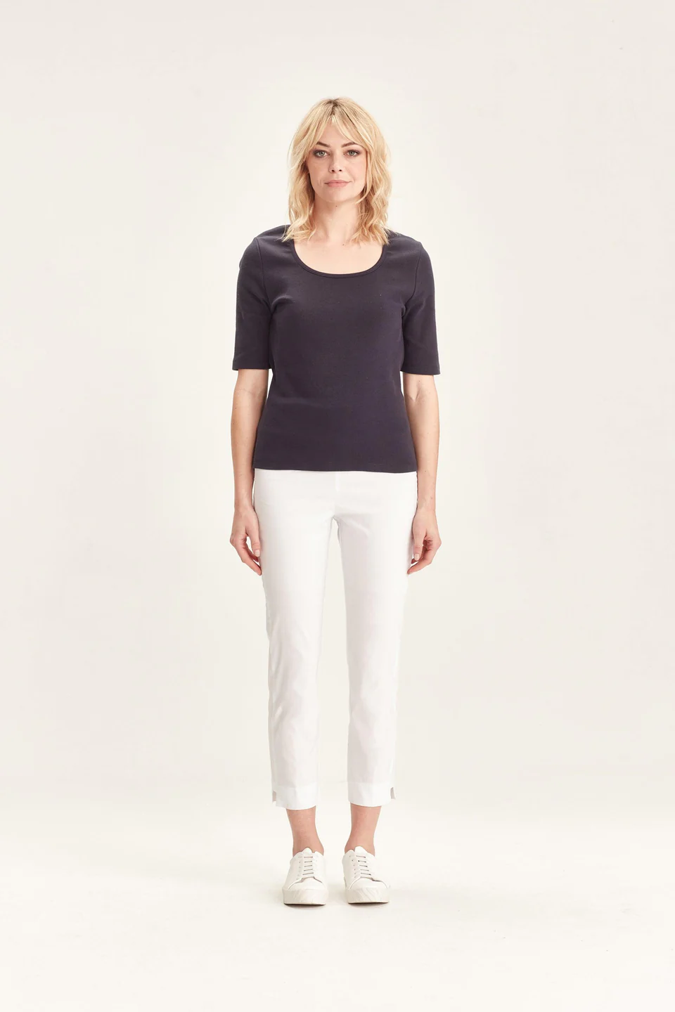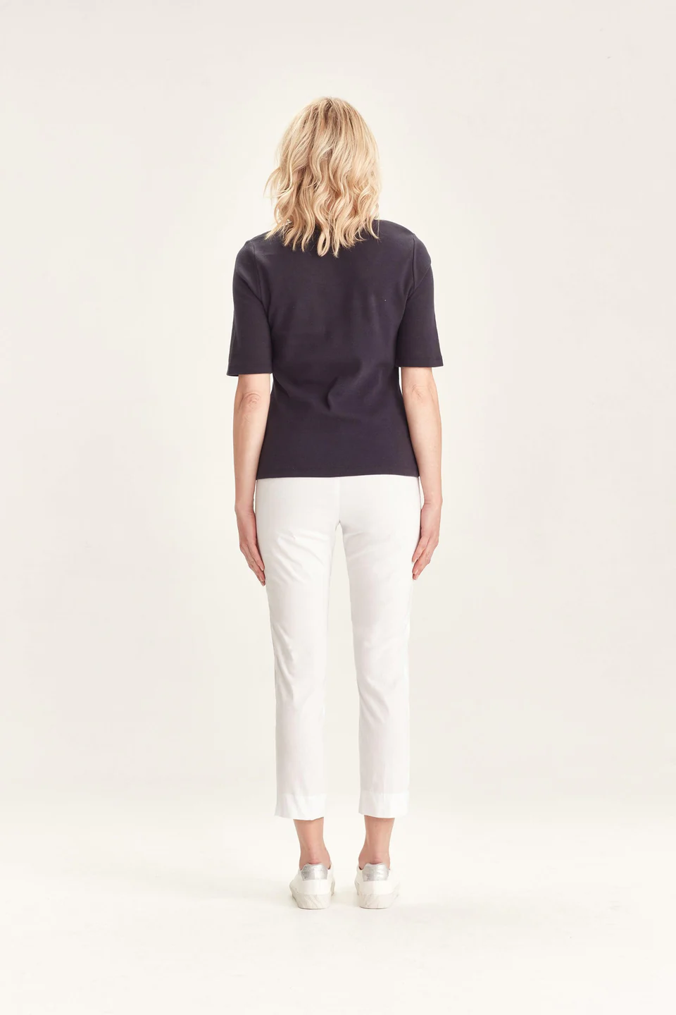 Crafted from VERGE's exclusive European lightweight stretch Cotton Acrobat fabric, the 7/8 length slim leg Desiree Pant offers exceptional comfort, breathability, and easy care. This stylish pant features a stepped hem, panel detailing down the sides, and a concealed elasticized waistband for a sleek, comfortable fit.