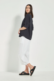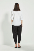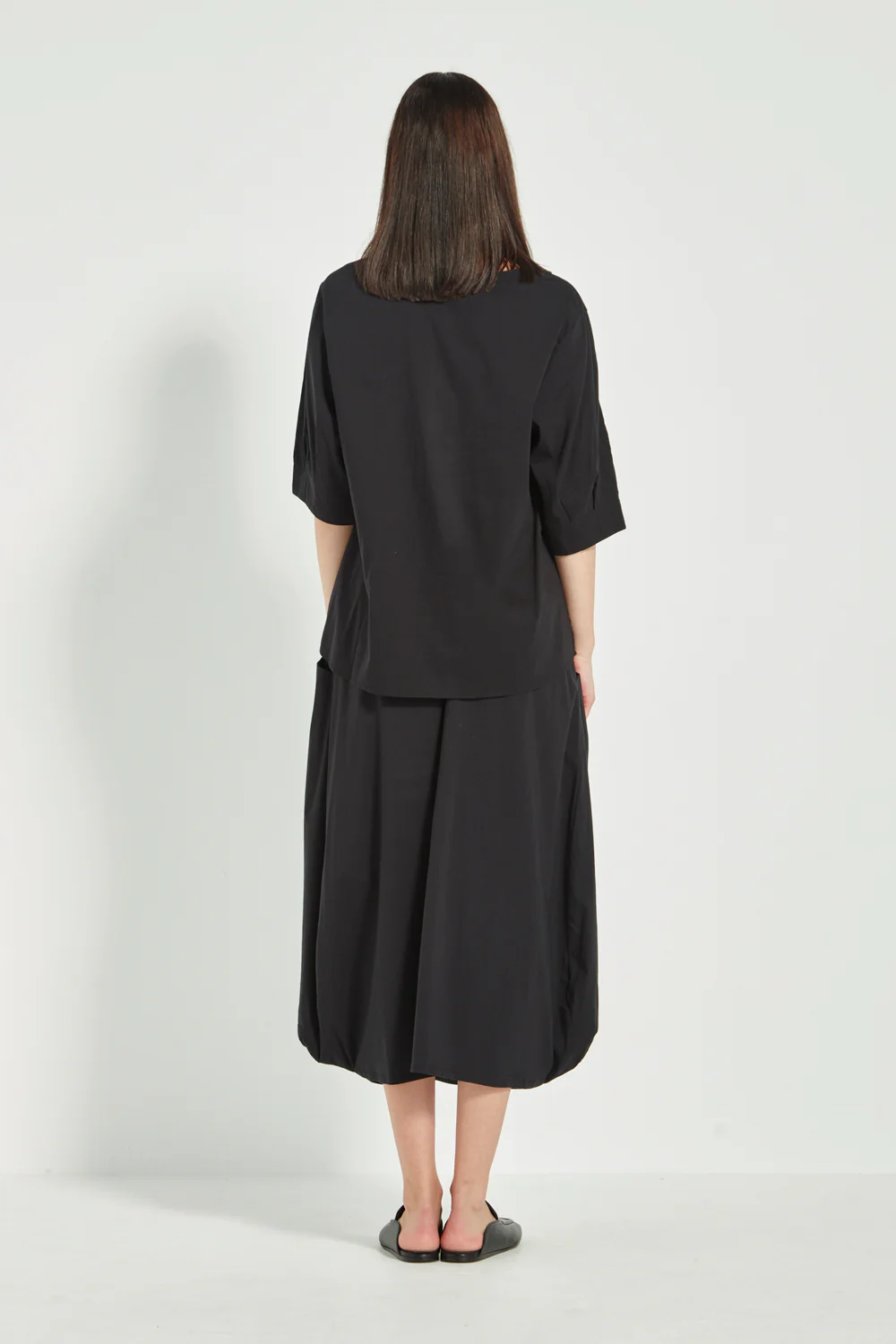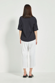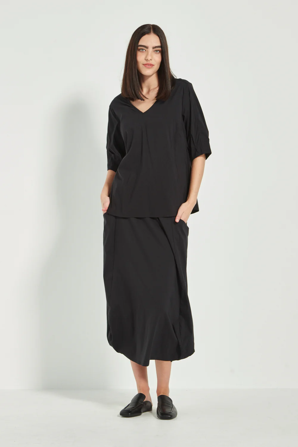 This V-neckline style features a set-in sleeve with subtle seam detailing along the upper arm and soft pleating at the cuff. Falling just above the elbow, the sleeve adds gentle volume without bulk. The top falls to the hip for a clean, versatile silhouette—perfect for layering or wearing solo.