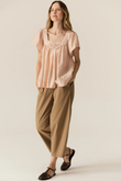 Flat waistband at the front with an elasticated panel at the back for comfort and ease