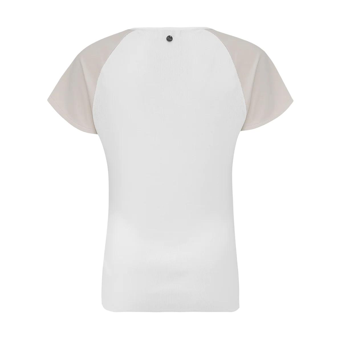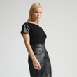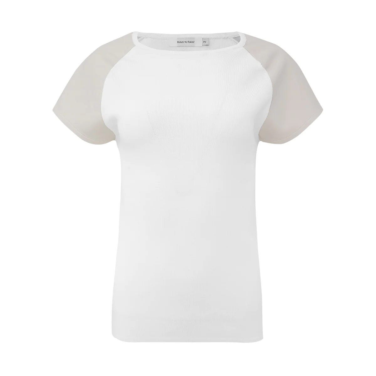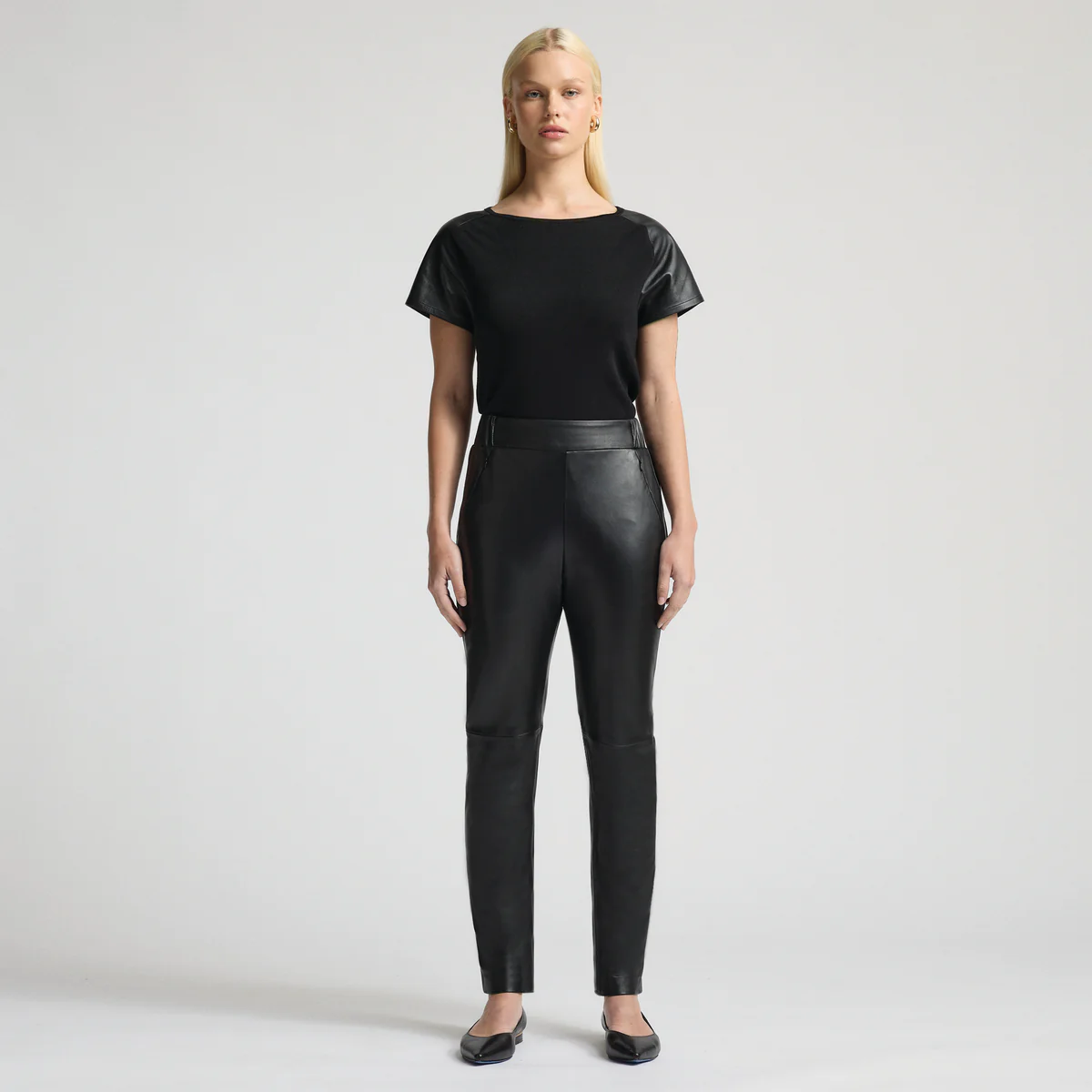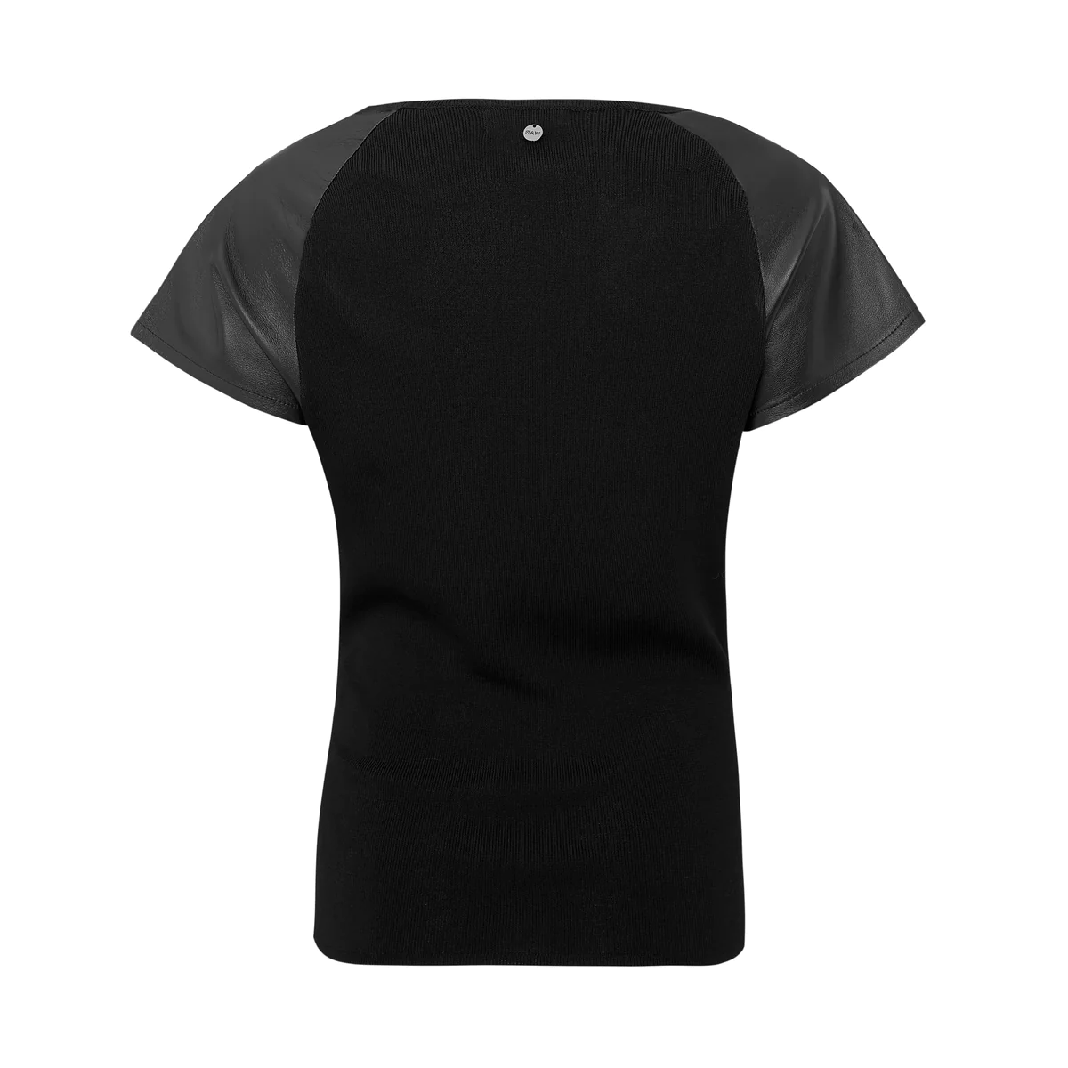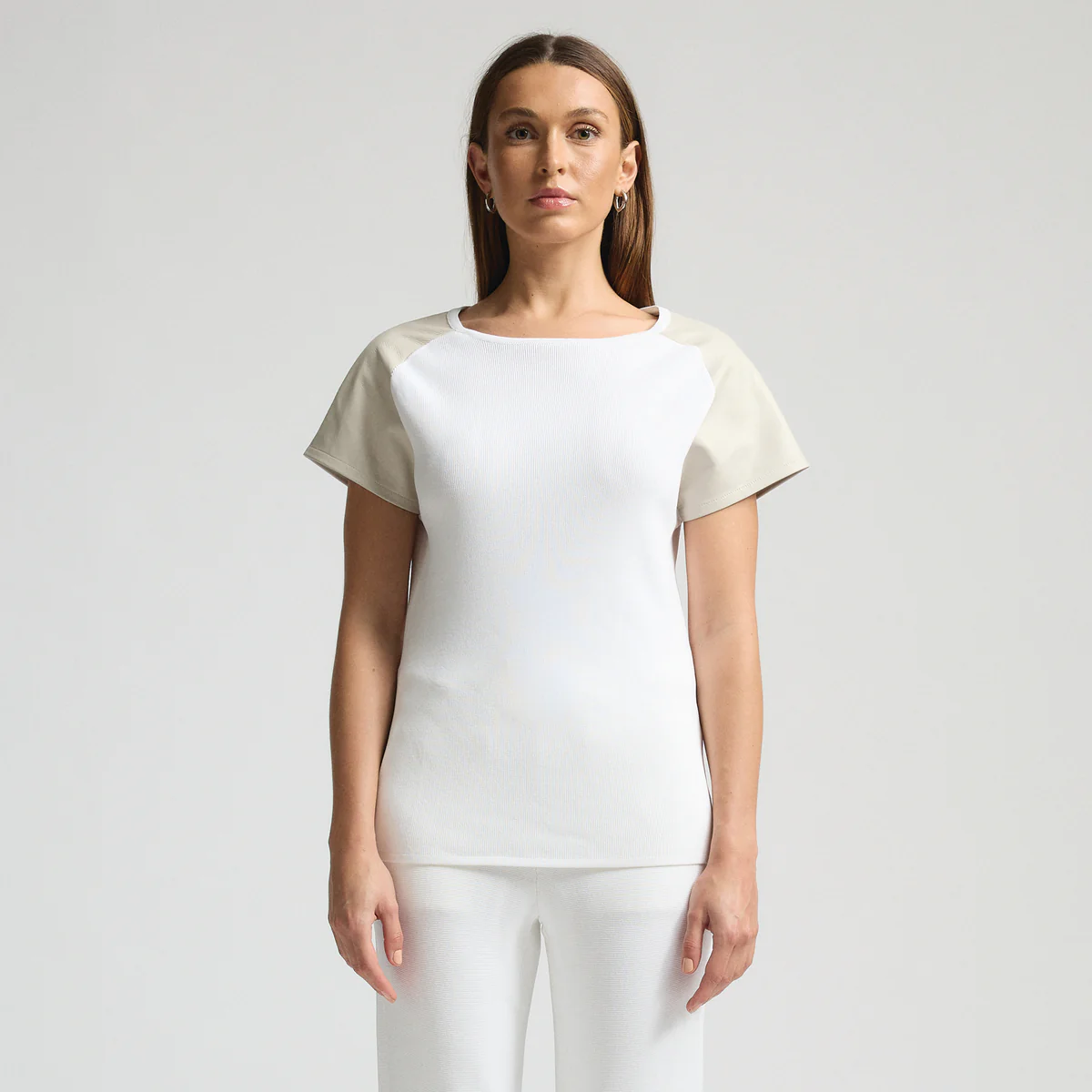 This fine ribbed t-shirt features leather raglan sleeves, adding a luxurious edge to its design, along with a flawless crew neck and a flattering cut.
