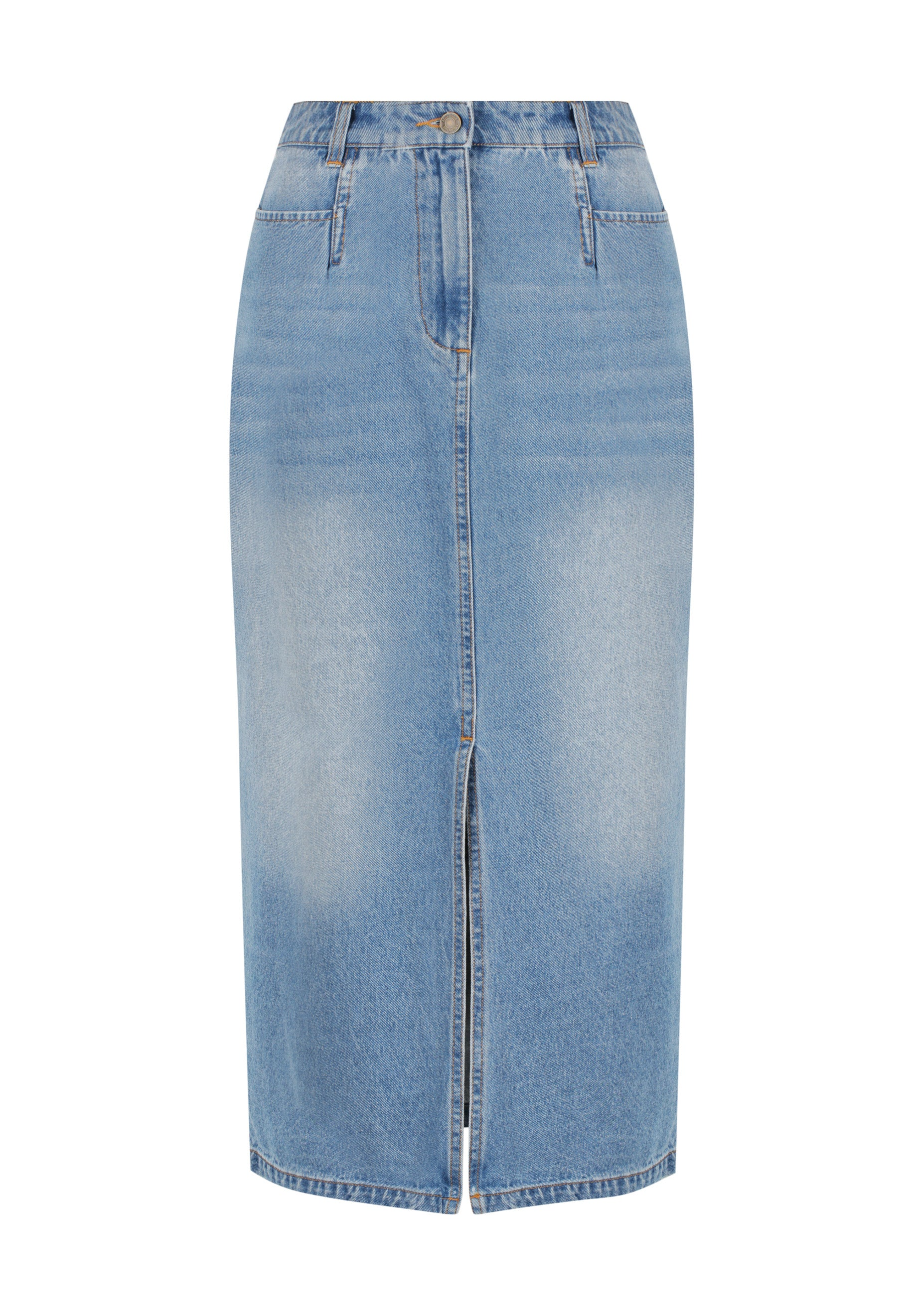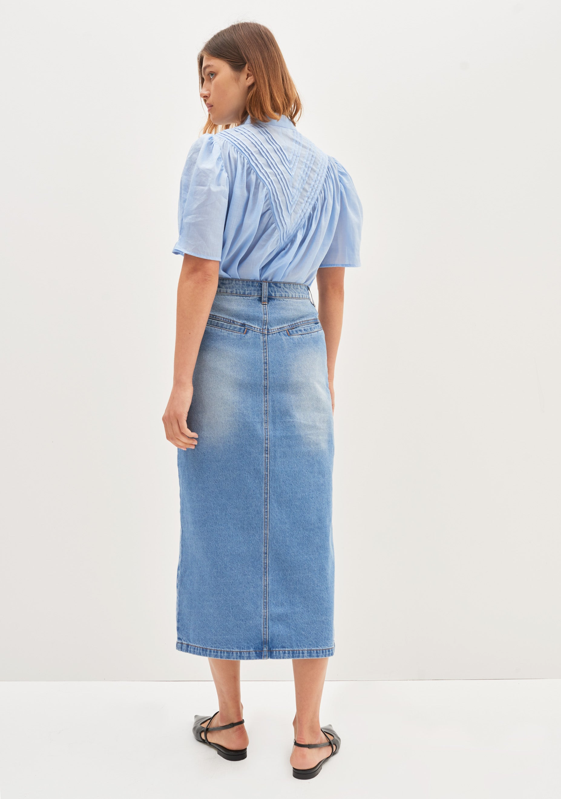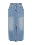 With a subtle back yoke seam, the 'Blanca Denim Skirt' offers a flattering fit that accentuates your curves. Its pencil skirt shape gives you a sleek and sophisticated silhouette, making it a versatile addition to your wardrobe.