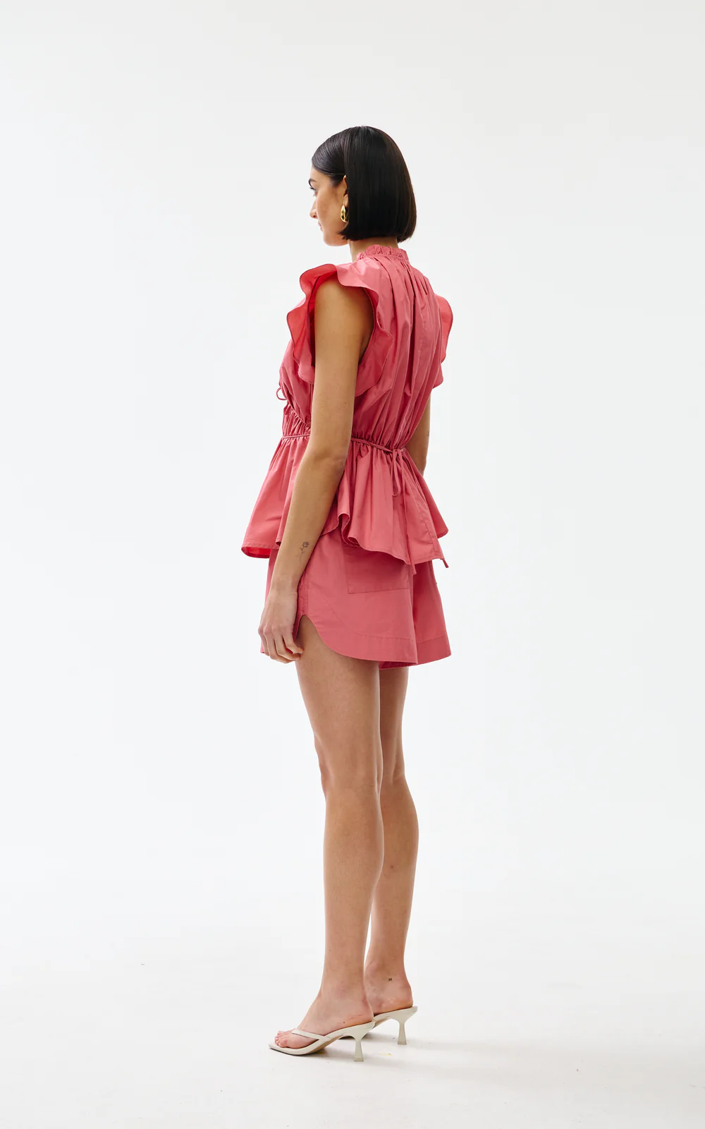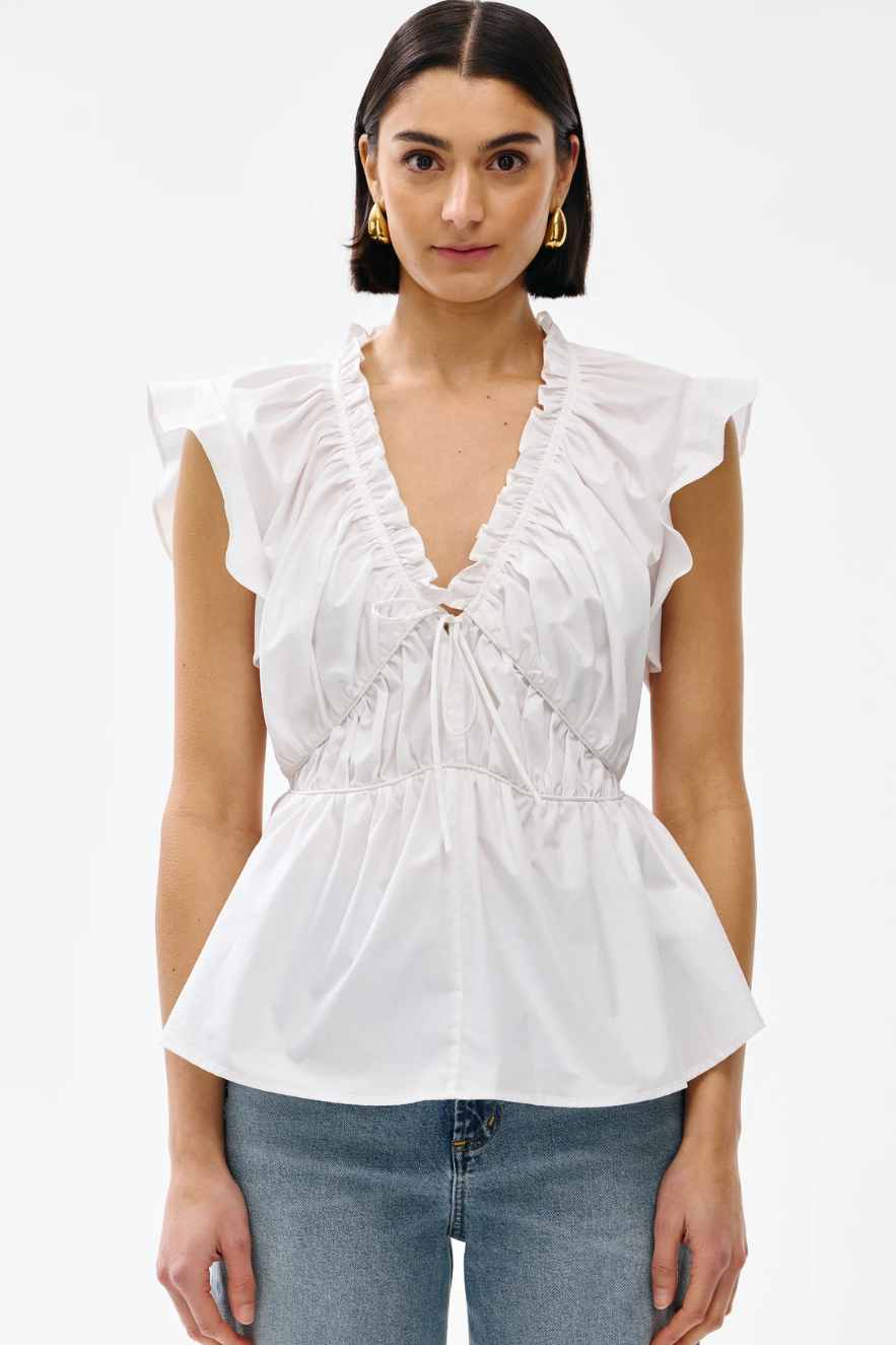 The Bobbie Top in Ivory by Kinney combines romantic detailing with modern versatility. Featuring a flattering V-neckline with ruffle trim and a drawstring waist, this blouse allows you to cinch and define your silhouette. Slightly ruffled sleeves and a peplum hem add a feminine, sophisticated touch, while the crisp 100% cotton fabric keeps the top fresh and structured.
