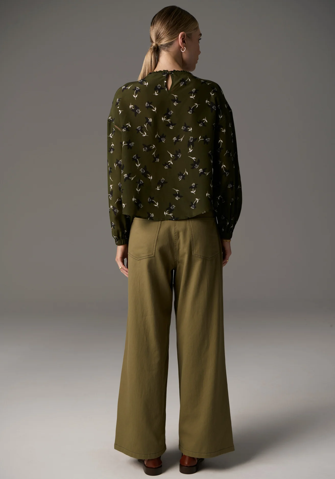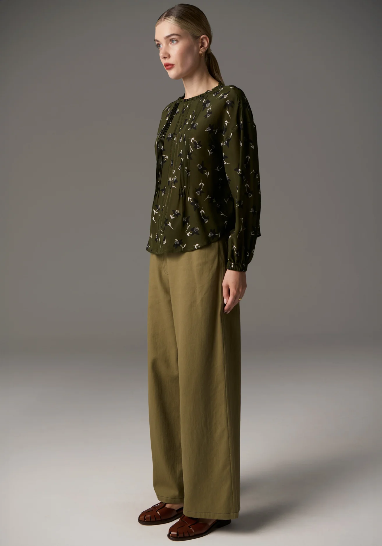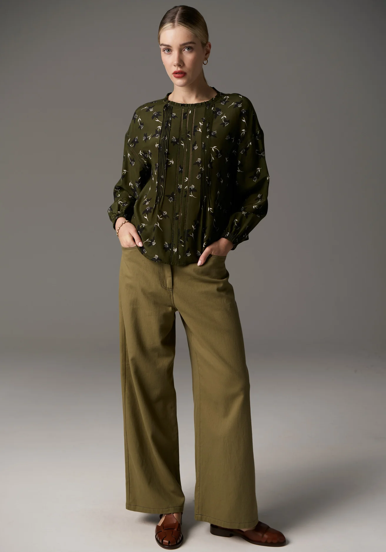 The Budlia Pintuck Top from POL Clothing combines pure silk with an exclusive print for a truly feminine touch. In a Khaki hue, this top features a round neckline with delicate frill detailing, complemented by a keyhole button fastening at the centre back. Pintuck and pointelle detailing along the front adds texture and interest, while the dropped armholes and pointelle shoulder accents elevate the design. The bracelet-length sleeves with elasticised cuffs complete the look, making this a beautifully versatile piece.