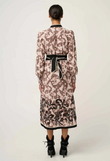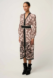 Showcasing an exclusive Russet Palm placement embroidery, the Camille Dress features intricate botanical motifs layered with graphic contrast trims for a bold yet timeless look. The curved hemline creates a flattering, elongated silhouette, while the self-tie waist belt defines the figure with effortless sophistication. A softly structured stand collar and button-through front complete the design, allowing for versatile styling from day to evening.