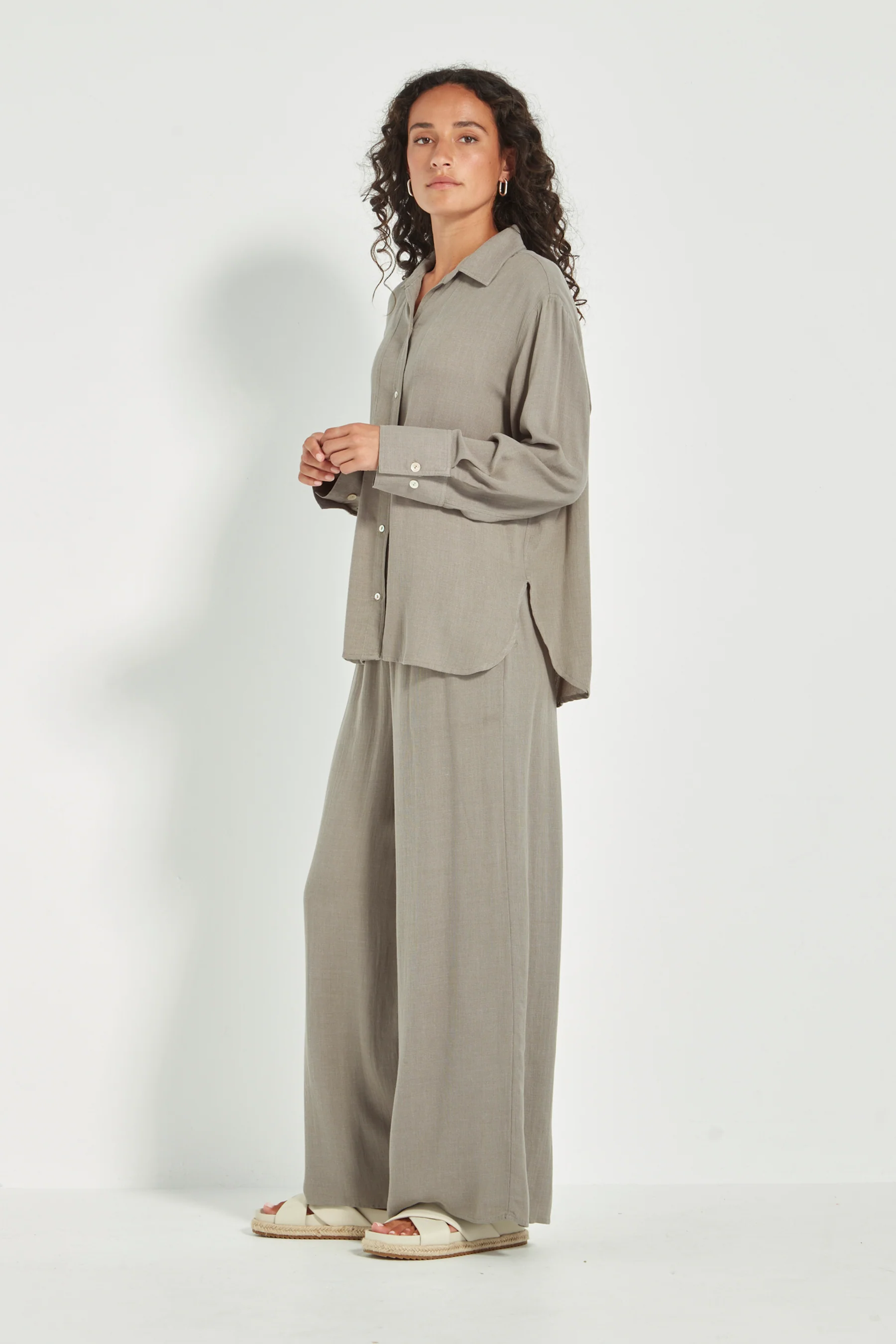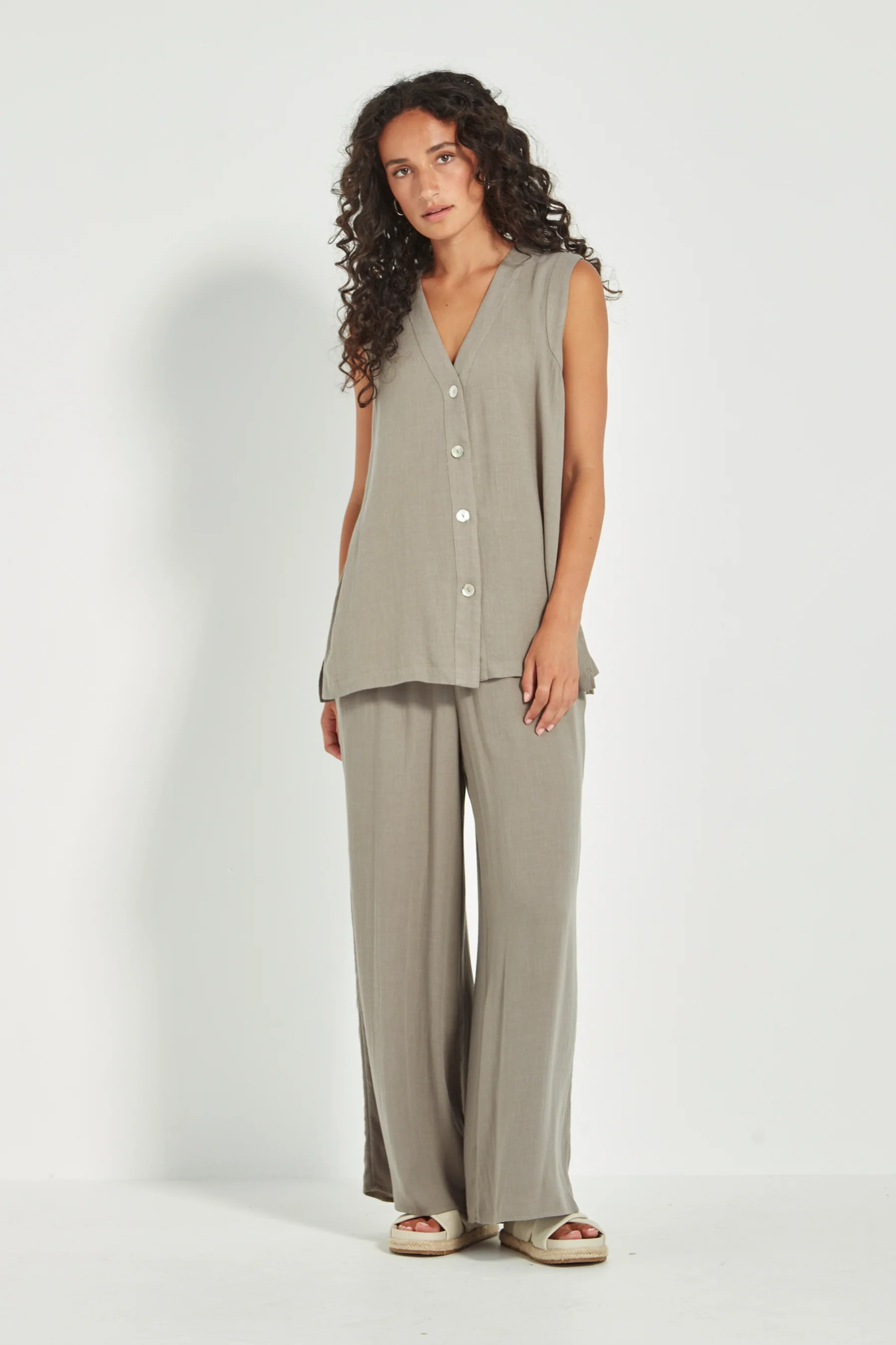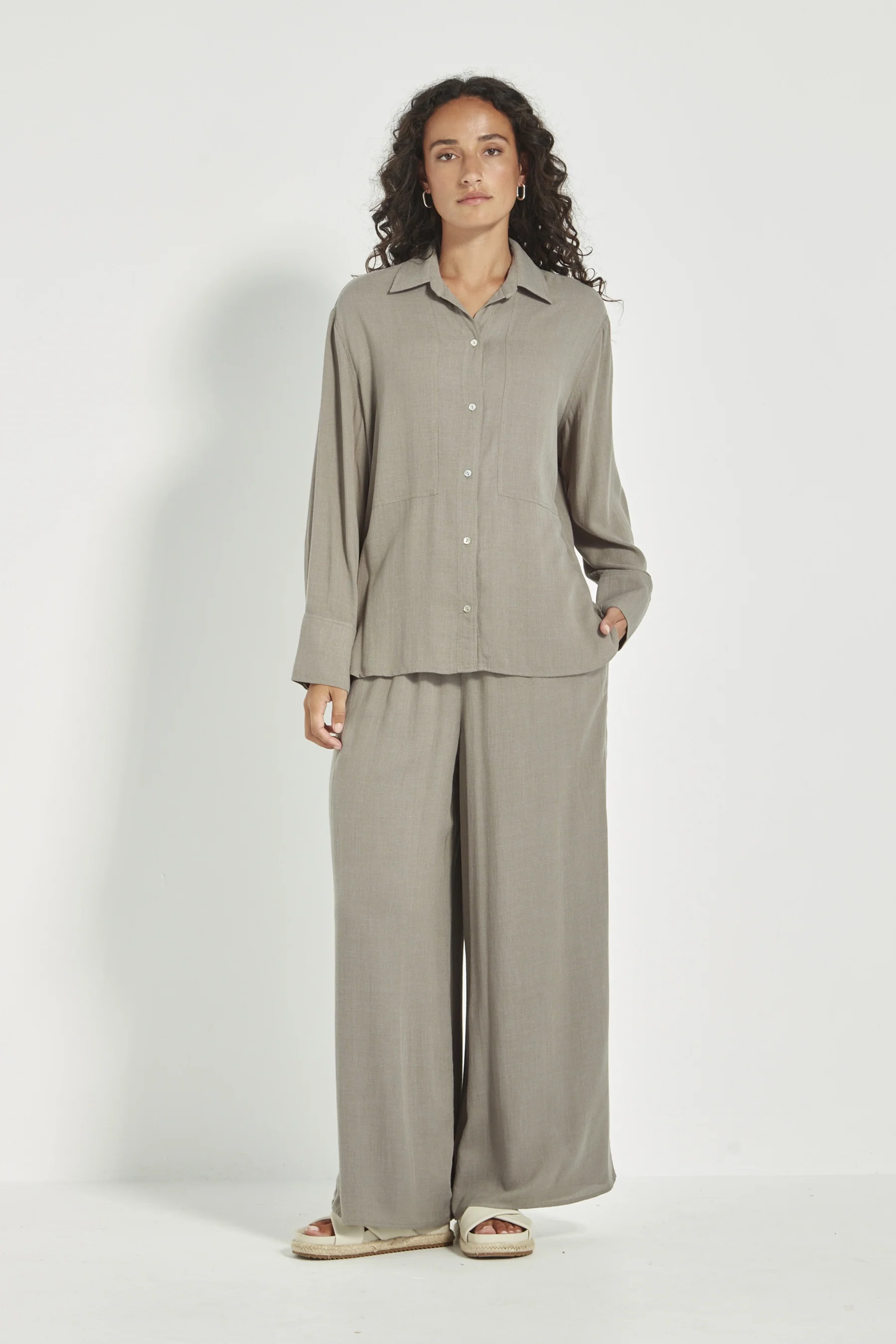 Relaxed elegance in every detail. The Verge Cayman Pant is cut in a soft weave mesh and designed with a full-length wider leg silhouette, elasticated waistband, and slant side pockets for everyday ease. Fully lined in self-fabric for a fluid, seamless feel.