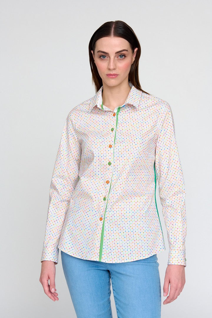 The Tinta Cenon Shirt is crafted from soft cotton poplin and features a vibrant floral geometric print. Designed with a straight cut, it includes a classic shirt collar and a front closure with colourful buttons. The long sleeves are finished with cuffs and a two-button closure, complemented by a green ribbon detail. A back pleat and slightly rounded hem add the finishing touches to this stylish and versatile piece.