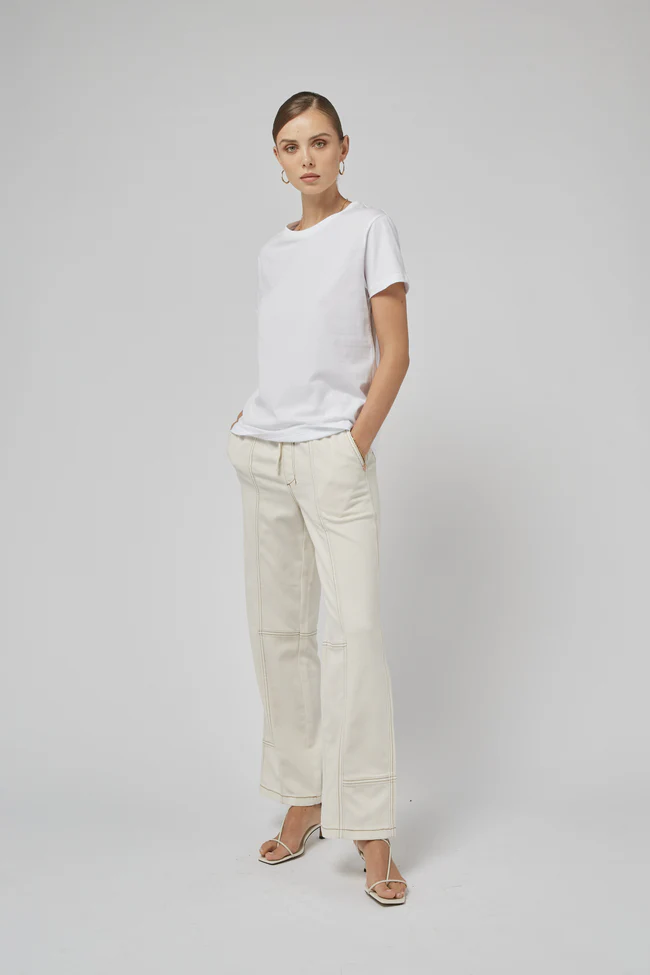 The Dricoper Clare Tee is a timeless staple, offering a classic regular fit with a clean, straight-cut design. Its structured yet relaxed silhouette provides a naturally slimming effect, making it a flattering choice for all body types.