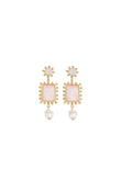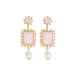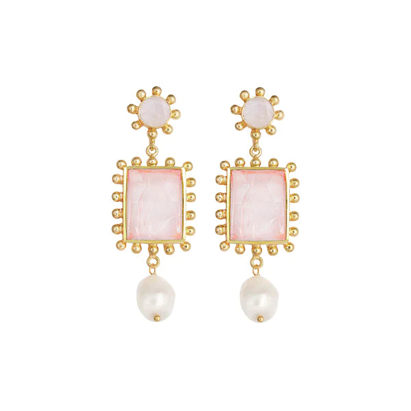 The Clementine Earrings by Bianc feature a statement gold plated brass drop design with Moonstone, Rose Quartz and Freshwater pearls. Sterling silver earring posts.