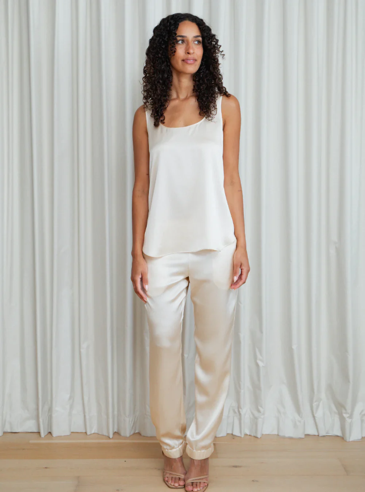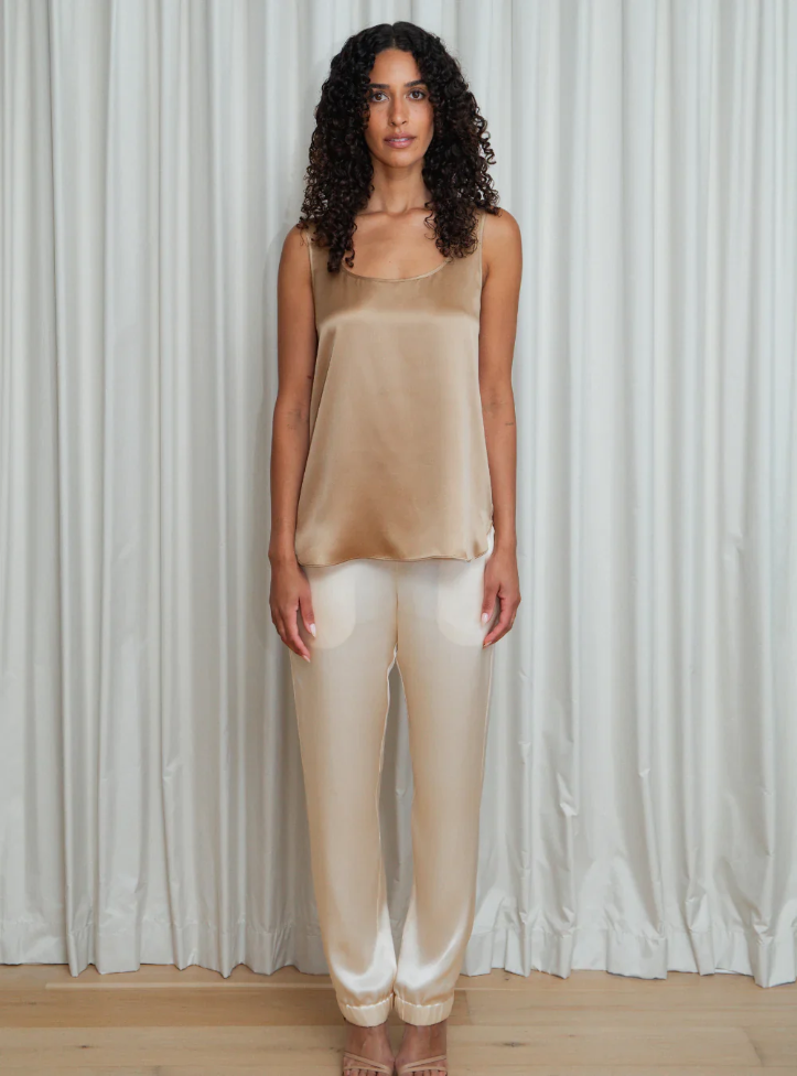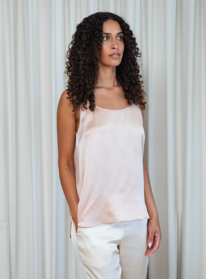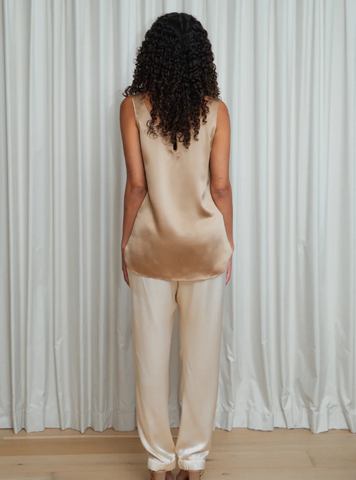 Effortlessly elegant, the Silk Degrees Comfort Cami is crafted from 100% Mulberry Silk with a satin finish for a luxe, softly structured drape. Designed with an elongated back hem and soft side curves, it flatters the figure while allowing versatile styling—from a gentle front tuck to a relaxed, cascading silhouette.