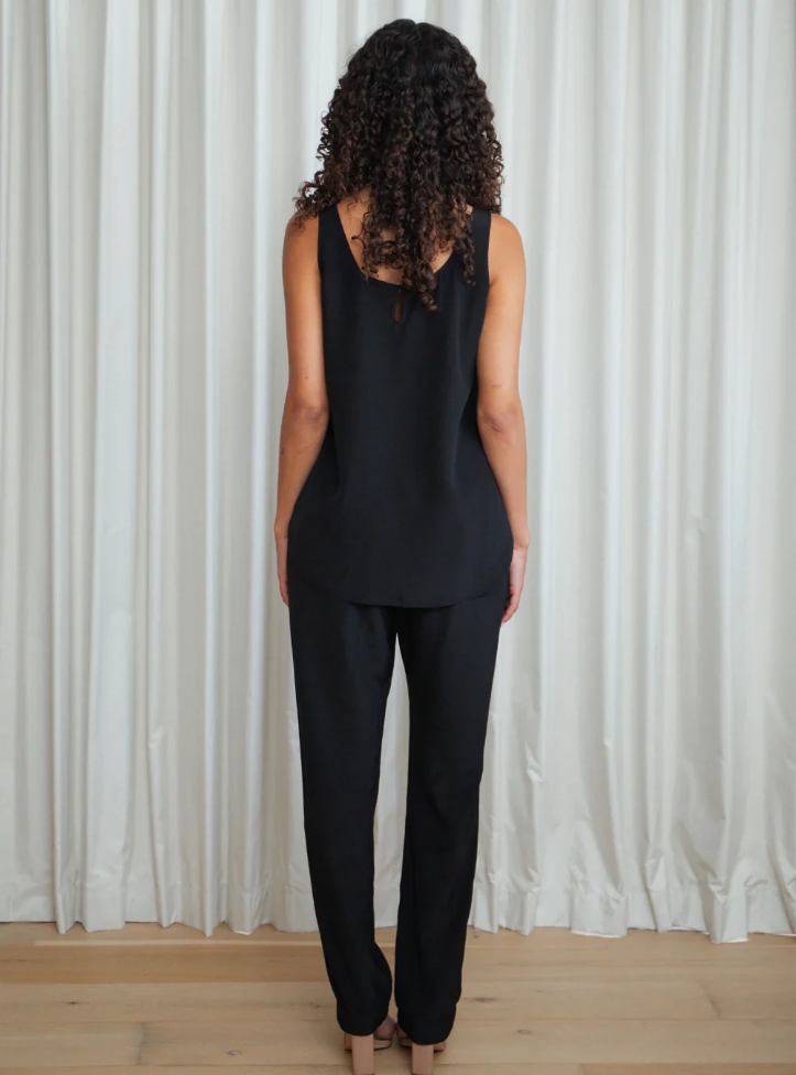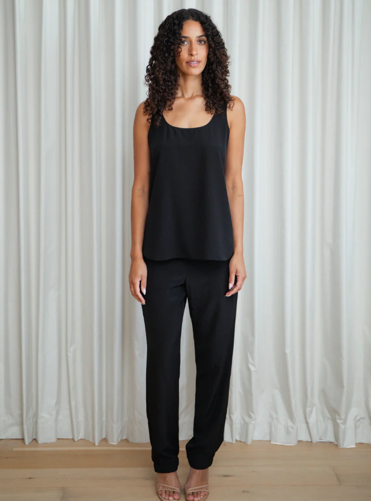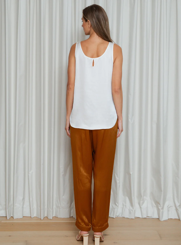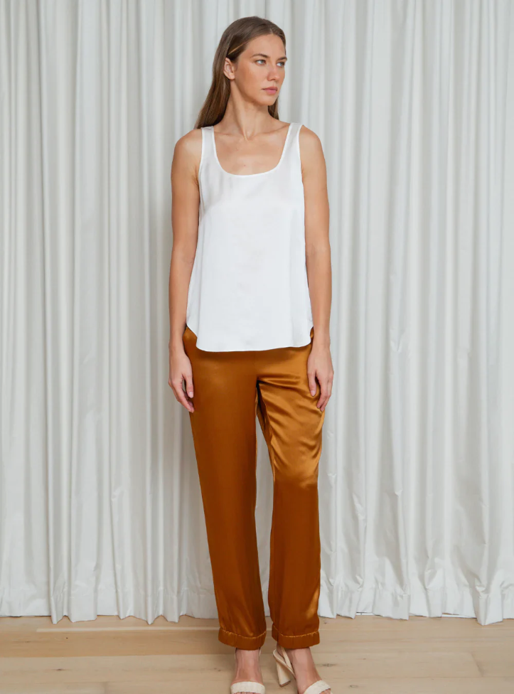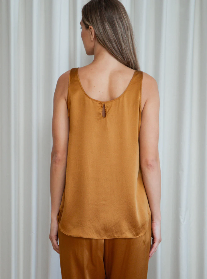 Effortlessly elegant, the Silk Degrees Comfort Cami is crafted from 100% Mulberry Silk with a satin finish for a luxe, softly structured drape. Designed with an elongated back hem and soft side curves, it flatters the figure while allowing versatile styling—from a gentle front tuck to a relaxed, cascading silhouette.