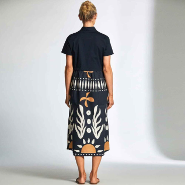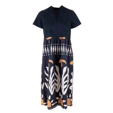 The PERUZZI V-Neck Cotton Dress in Blue, Cream & Tan brings effortless elegance with a modern edge. The plain bodice and mandarin collar create a polished silhouette, while the full skirt with tan print detailing adds graceful movement and charm.