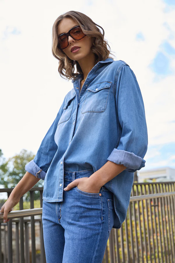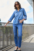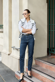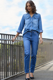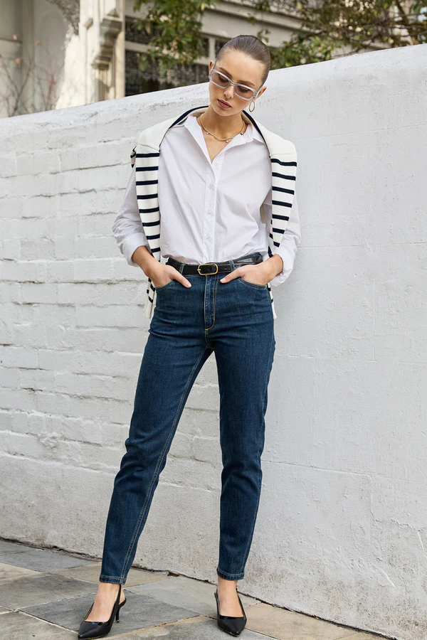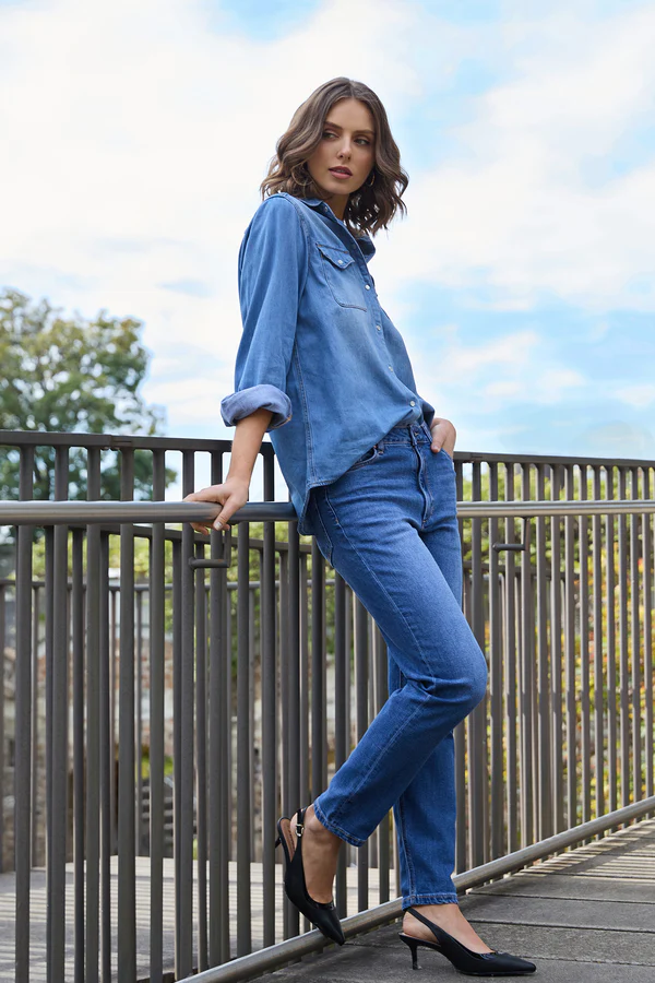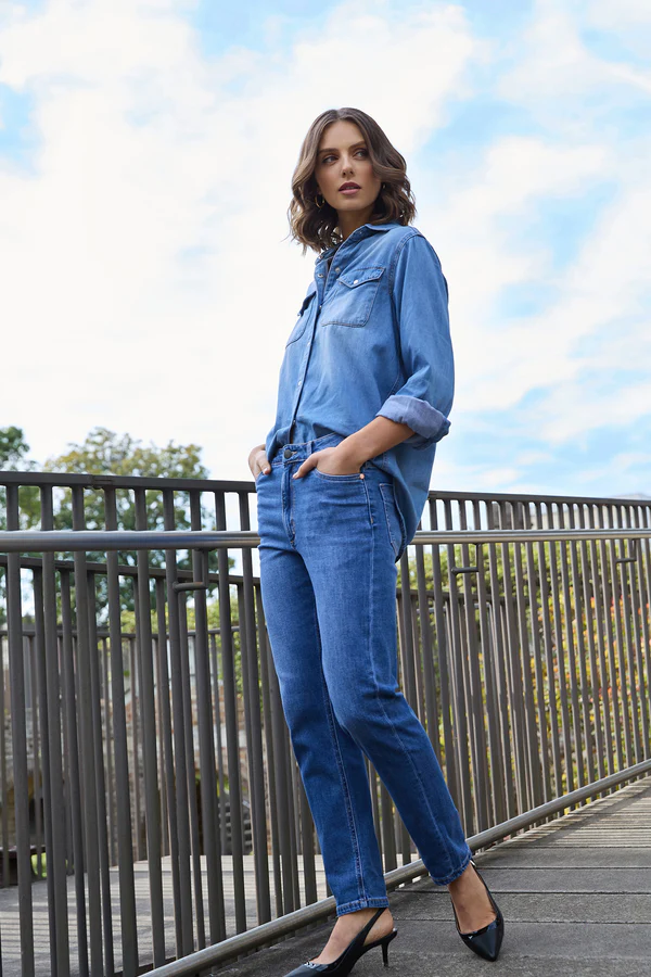The Dricoper Danika Jean features a tapered slim-leg design with a rise that sits between mid and high, just below the waist and above the hip. Crafted from cotton-rich fabric, these jeans offer both comfort and a flexible fit.