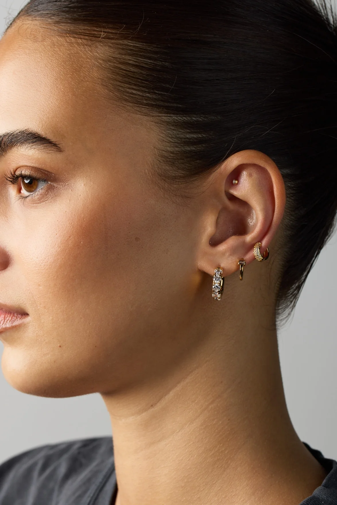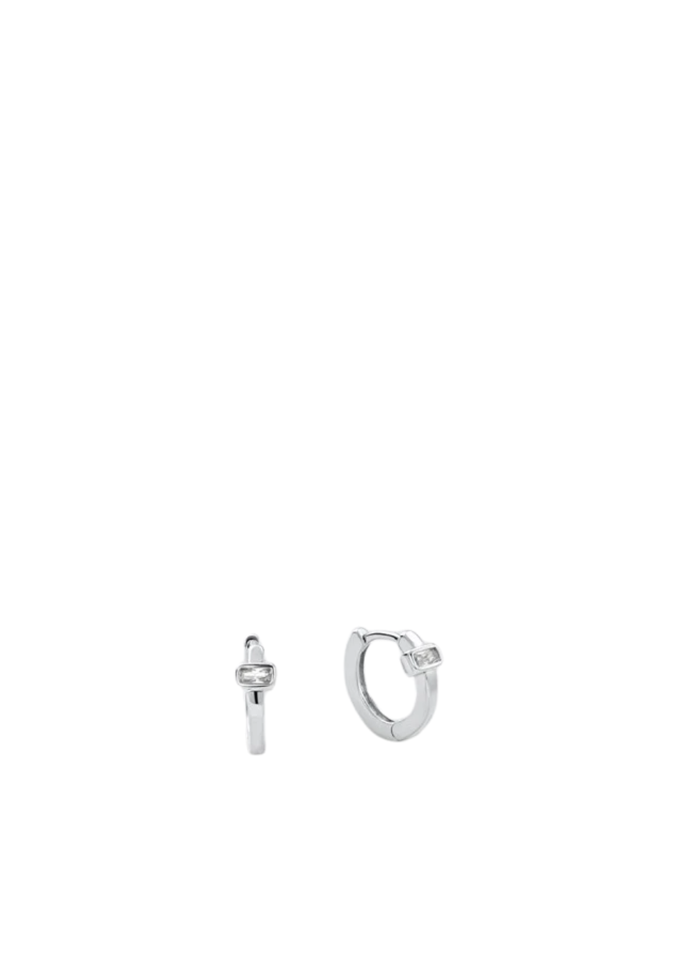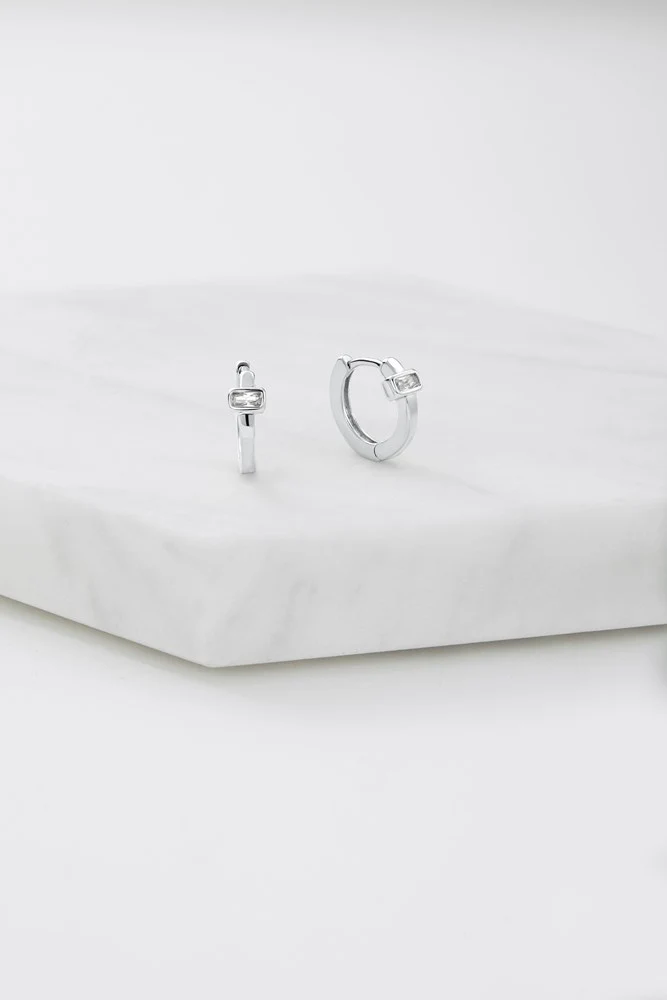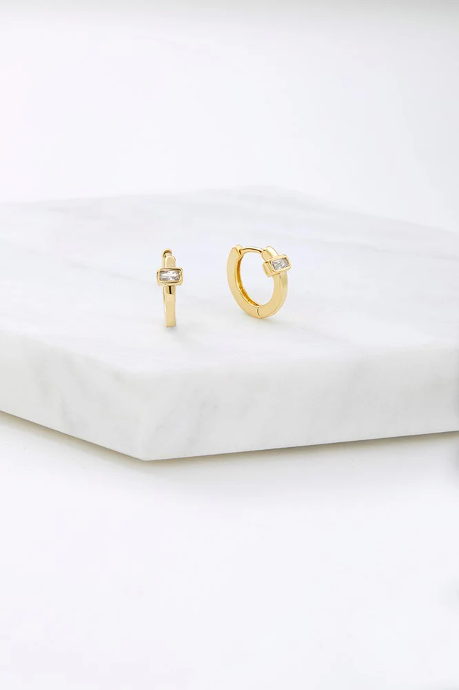 Chic and minimal, the Zafino Elsie Huggie features a baguette-cut crystal that catches the light with refined sparkle. Crafted for comfort and elegance, it's the perfect everyday piece—whether worn solo or layered in an ear stack.