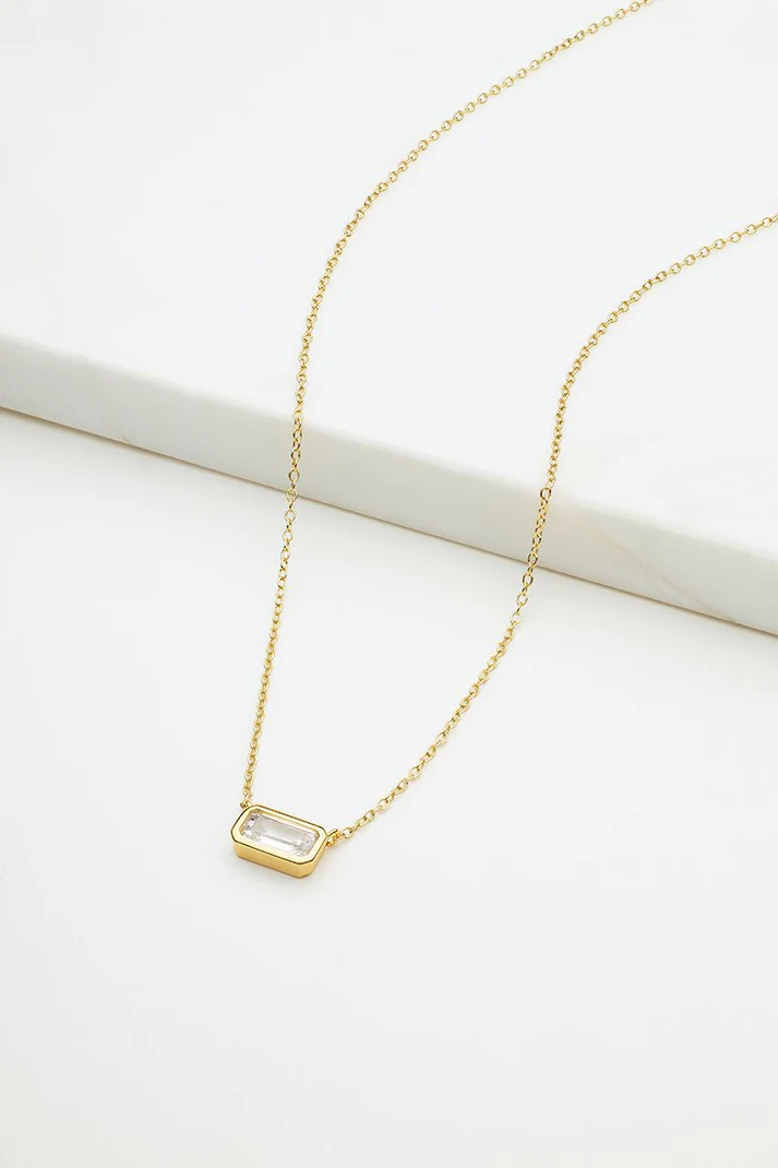 The Zafino Emily fine chain necklace showcases a sleek crystal rectangle pendant, offering a refined and minimalist design. Its sparkling simplicity adds a touch of elegance to any ensemble, making it a versatile piece for both casual and formal occasions.