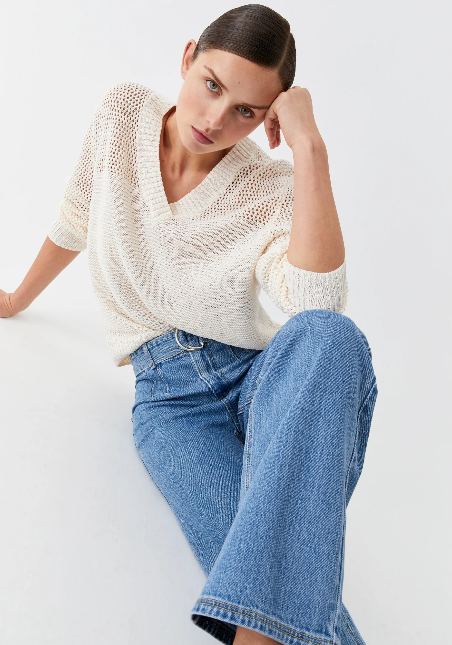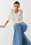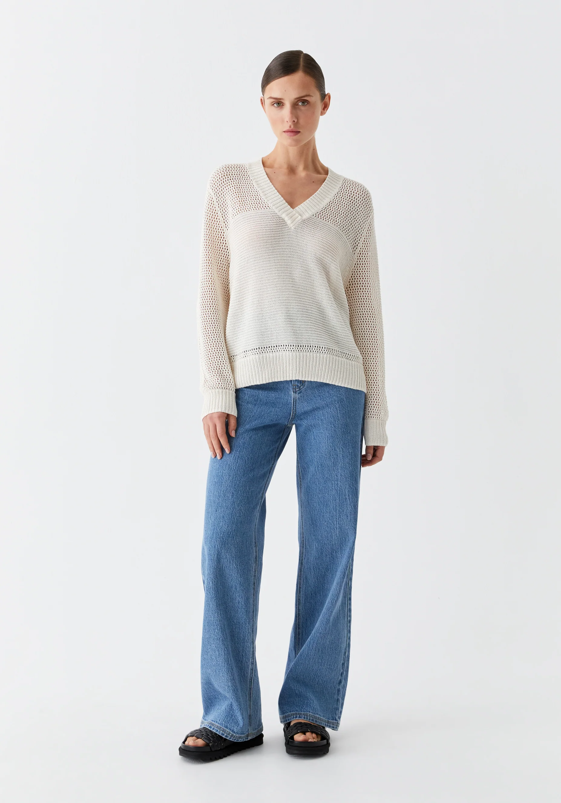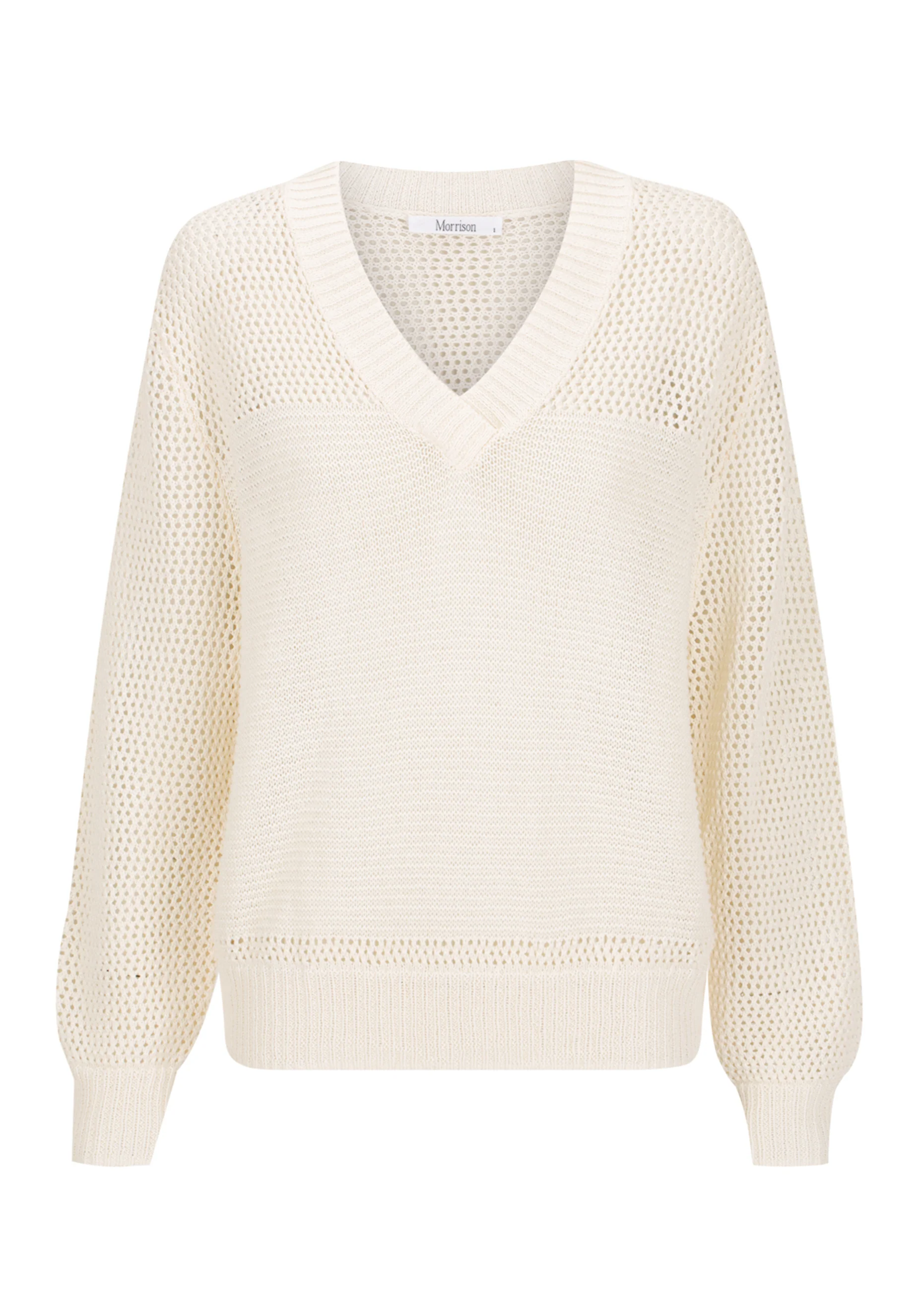 The Morrison Emme Knit Pullover is a timeless staple, crafted from a soft cotton blend yarn for effortless comfort. Featuring a flattering V-neckline and full-length sleeves, this pullover offers a regular fit through the body. Delicate mesh stitch detailing through the yoke and sleeves adds subtle texture, while jersey stitch panels at the bust provide a refined finish.