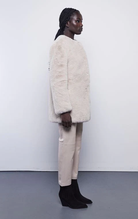 Indulge in timeless elegance with the DEA Faux Fur Long Coat in Aspen. Featuring a round neck and a slightly oversized silhouette, this coat effortlessly transitions from casual daytime chic to evening glamour.