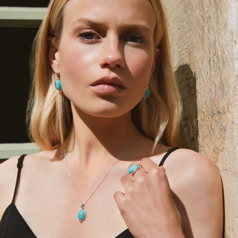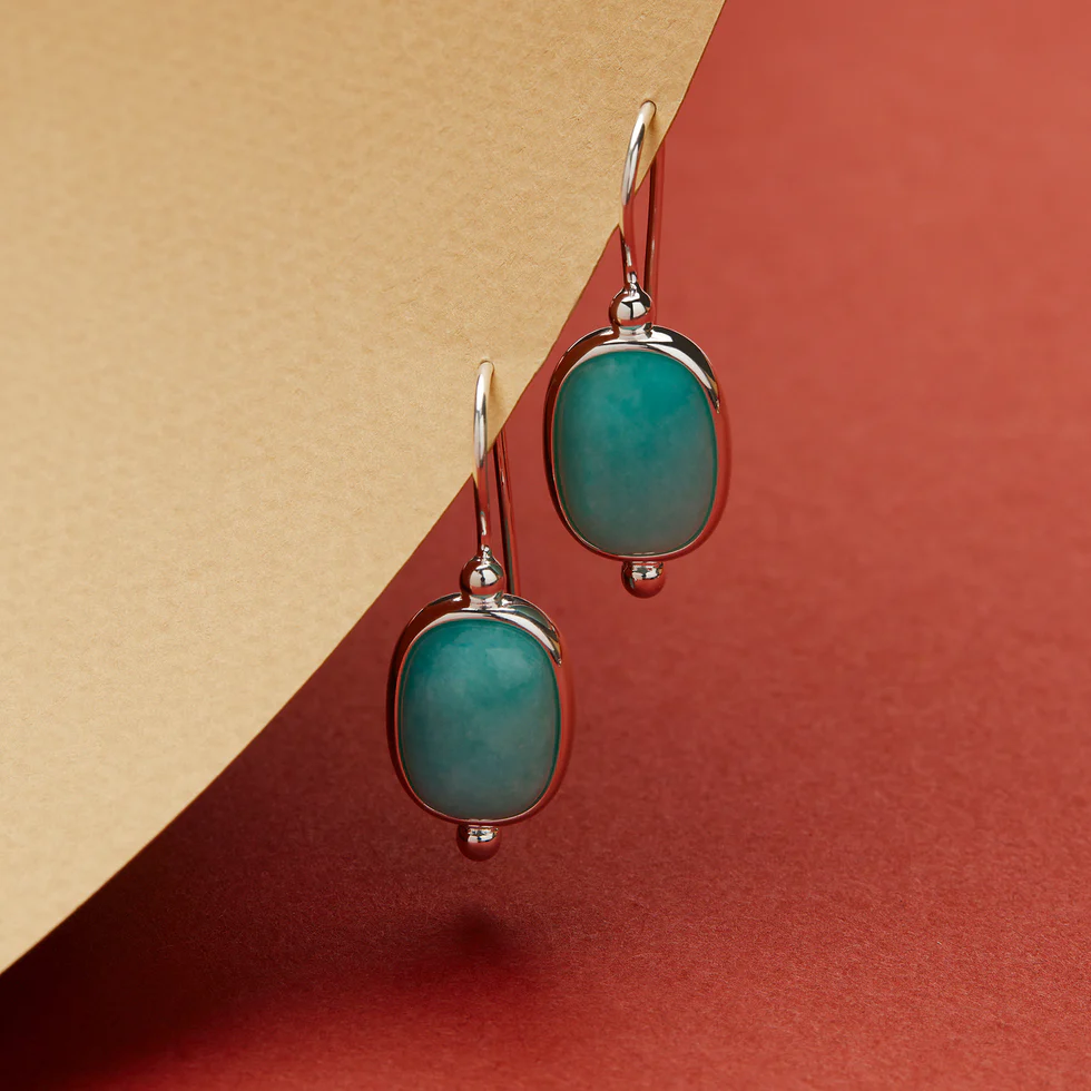 Inspired by Paris in bloom, the effortlessly glamorous NAJO Fleur Earrings channel the soft light and fluid beauty of springtime Impressionist watercolours. Their impeccably crafted design is defined by the most beautiful rectangular amazonite cabochon gemstones. The intentional open-back design of the sterling silver settings invites the light in, allowing these stones of calm to emit an ethereal lagoon-green glow.