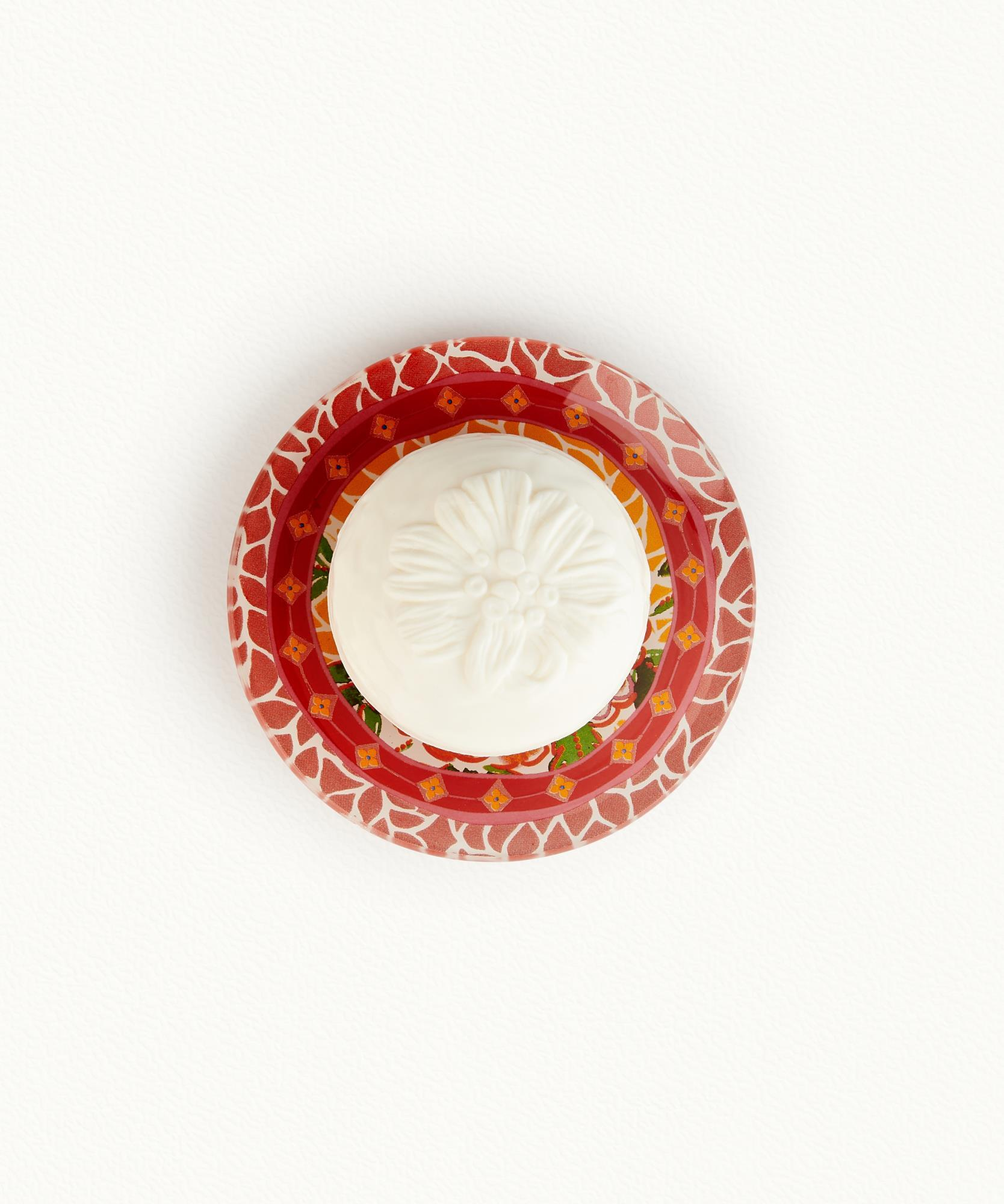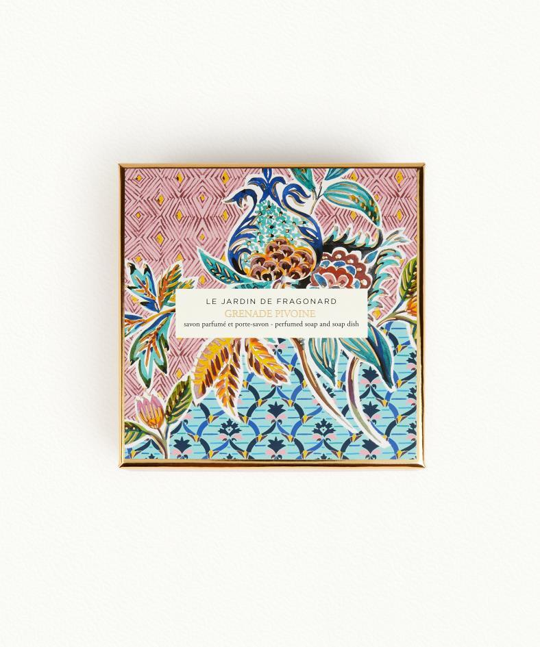 Grenade - Pivoine (Pomegranate - Peony). The iconic engraving on this soap and this soapdish release the delicious pomegranate fragrance that it represents, blended with a heart of peony and rose absolute on woody base notes of cedar and oak.