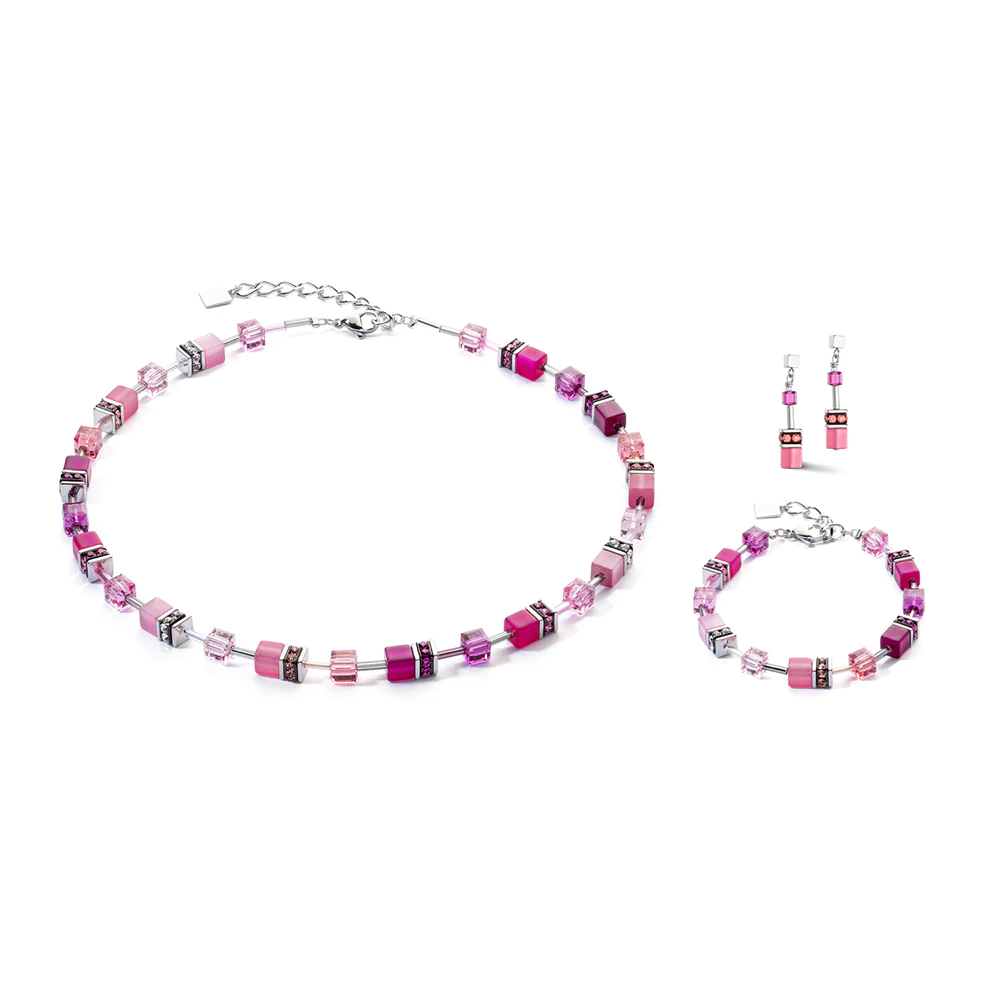 The Geocube Viva Magenta Bracelet pairs perfectly with the matching Geocube Viva Magenta Earrings and Necklace, creating a complete and coordinated look that is sure to turn heads.