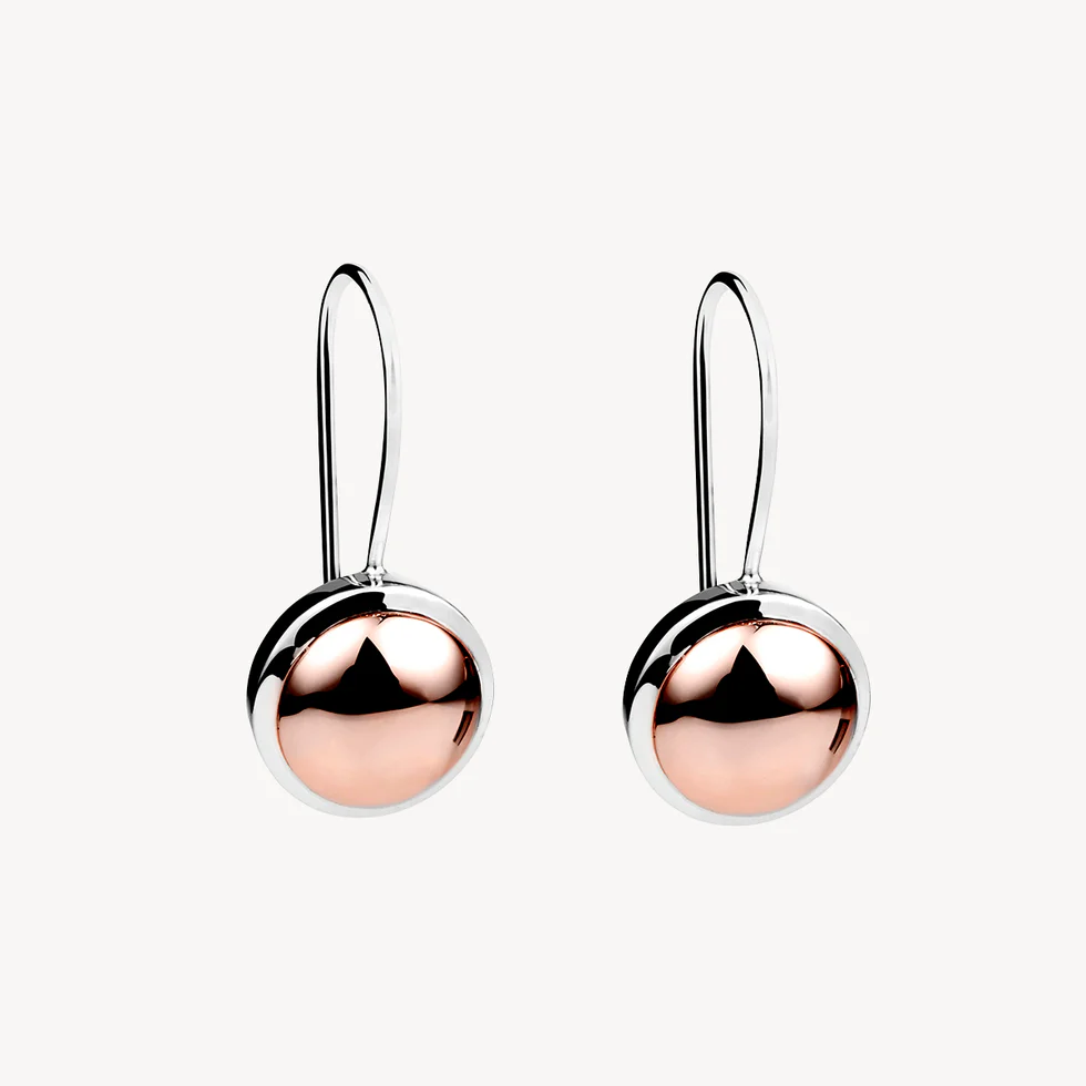 Experience the entrancing beauty of the Najo 'Glow Earring' in two-tone Silver and Rose Gold, perfect for transitioning seamlessly from the boardroom to the bar. The contemporary sterling silver bezel is expertly crafted to showcase the raised dome, creating a stunning glow that will enhance any outfit.