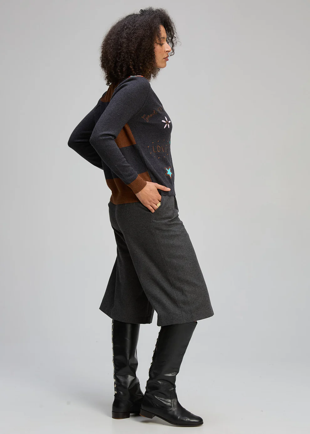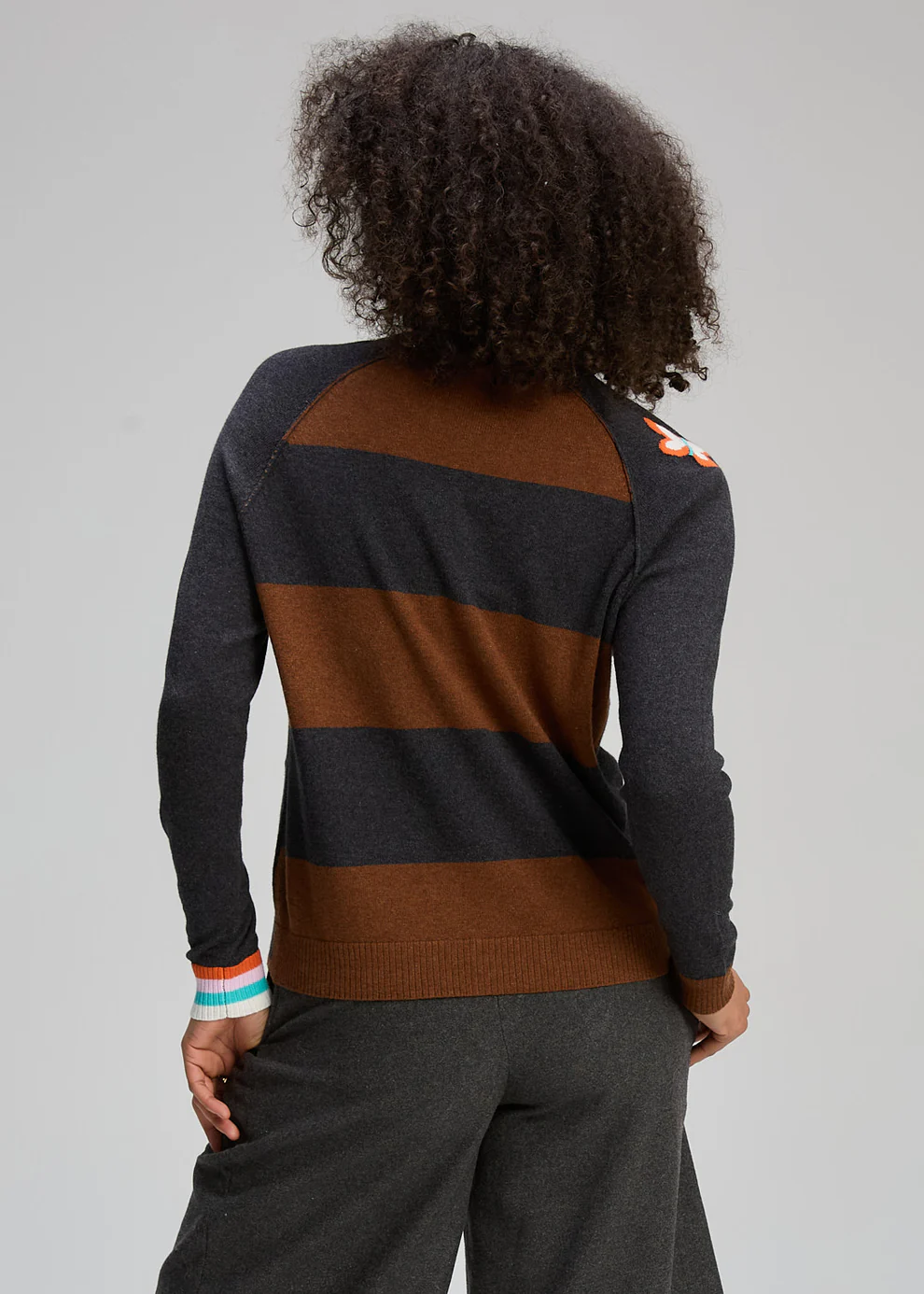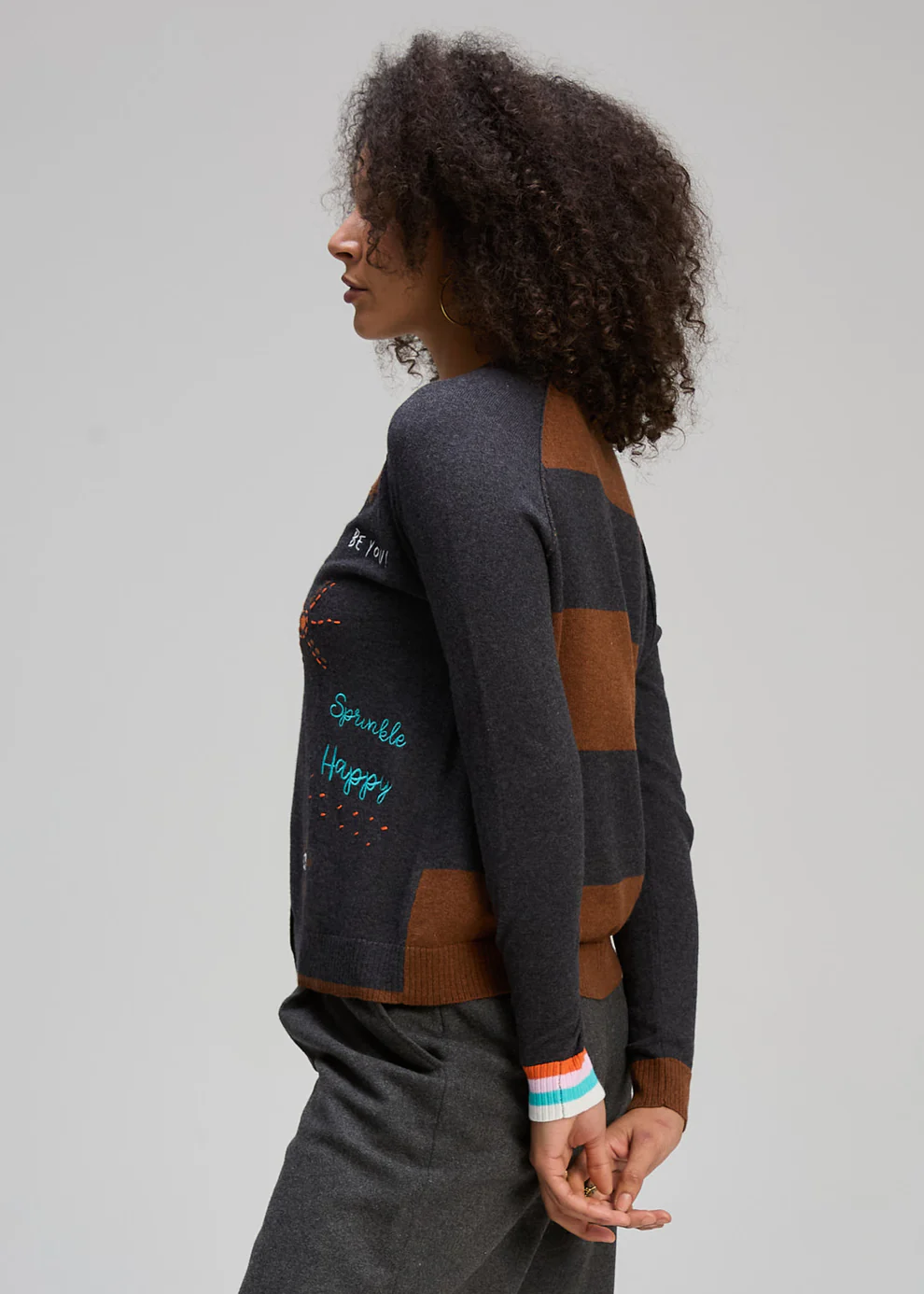 Featuring a classic button-up front, the Zaket & Plover Good Energy Cardi is brought to life with fun, youthful statement stitching and doodle-inspired patterns throughout. The charcoal base is elevated with vibrant pops of colour on the hems and asymmetrical patterned cuffs, while a striped back adds unexpected contrast and visual interest. Modern, playful and full of personality, this piece is perfect for layering with a creative edge.