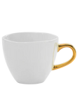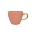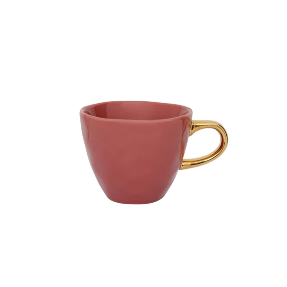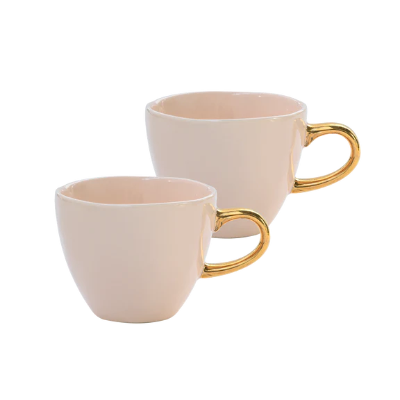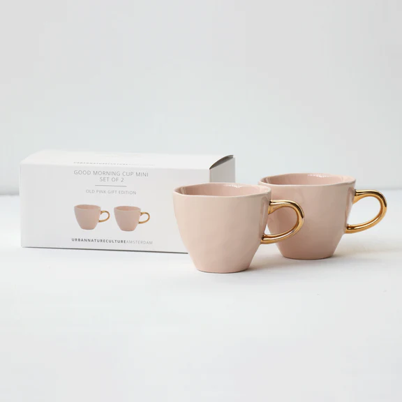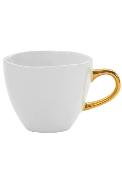 Just like it's bigger sibling, the Good Morning Coffee Cup is crafted with soft tones and a luxurious golden handle, designed to bring a touch of elegance to your morning routine. Whether you're rushing off to work or taking a relaxing day off, the Good Morning Cup is the perfect way to enjoy your caffeine hit!
