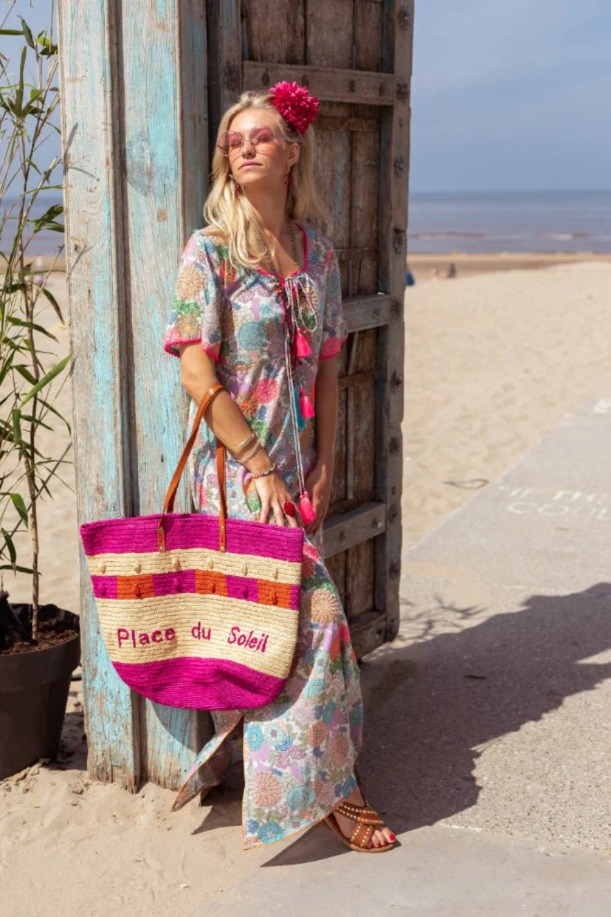Step into summer with the Green Rosa Dress by Place du Soleil, a playful and stylish piece perfect for sunny days. Featuring a vibrant floral print in green, blue, and pink, this lightweight dress combines comfort with fun detailing. The square neckline with slit and tassel ties, short sleeves, and side seam slits create a breezy, flattering fit, while the stitched bright pink edging adds a charming accent. Perfect for a day at the beach or casual summer outings, this dress brings effortless style to your wardrobe.