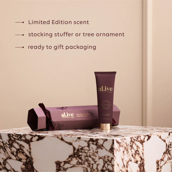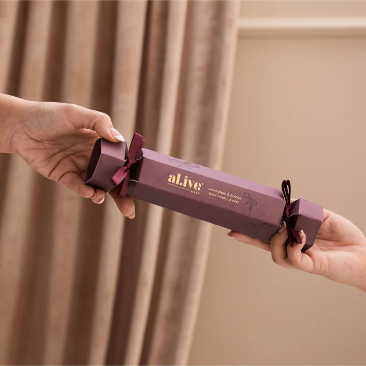 Housed in a festive cracker that doubles as both a charming ornament and the perfect table decoration, the beautifully presented al.ive body Hand Cream Crackers make gifting effortless.