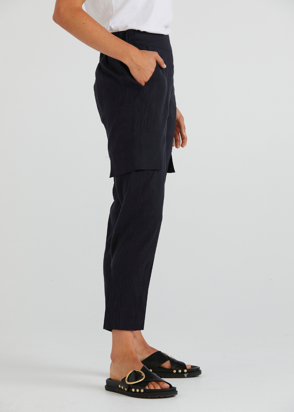 Embrace effortless style with the Harrington Pant in Ink from Lania The Label, made from a breathable linen blend. Featuring a pull-on design, these pants offer a smooth front with a faux fly and an elasticated back waist for ultimate comfort. The modern patch pocket detailing adds a contemporary edge to this versatile staple.