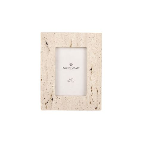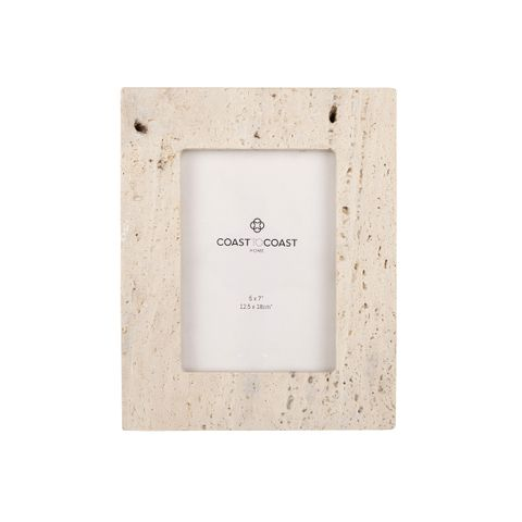 The Coast to Coast Len Travertine Photo Frame in Beige offers a beautifully textured look, bringing natural elegance to your space. Crafted with a travertine-inspired finish, it adds warmth and sophistication to your treasured photos. Available in 4x6 and 5x7 sizes.