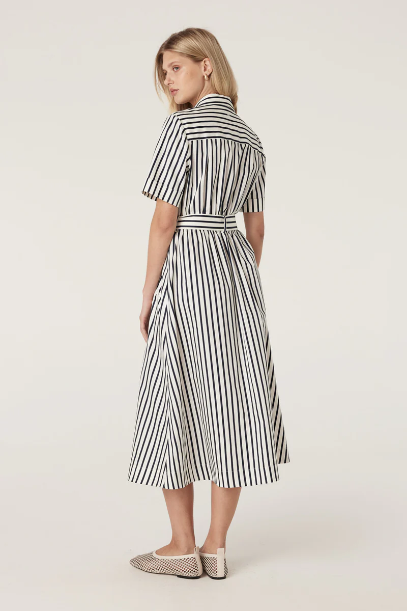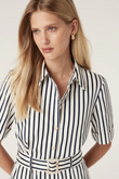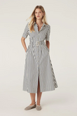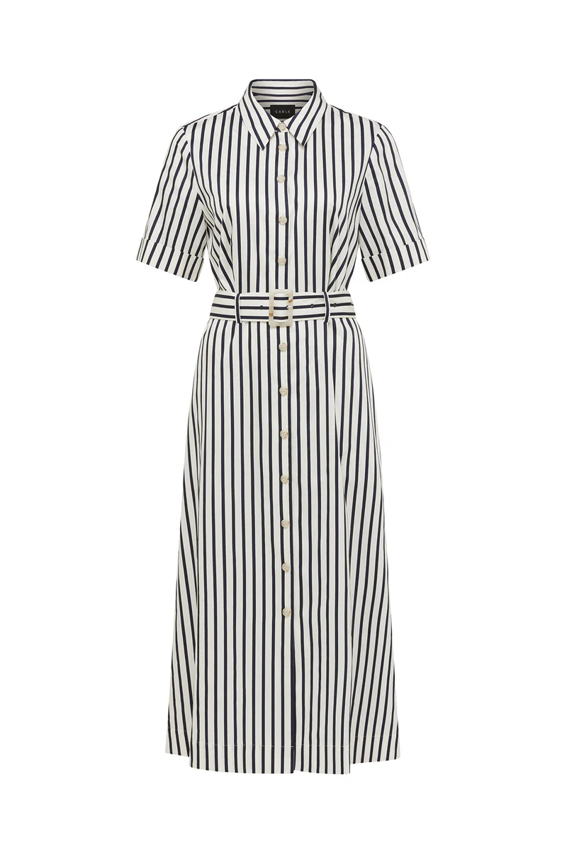 The Cable Melbourne Lina Stripe Shirt Dress is cut in a regular fit from crisp cotton sateen for a polished yet comfortable feel. Featuring a button-through front, side pockets, and an elasticated back waist, it’s finished with a matching belt and buckle to define the silhouette with ease.