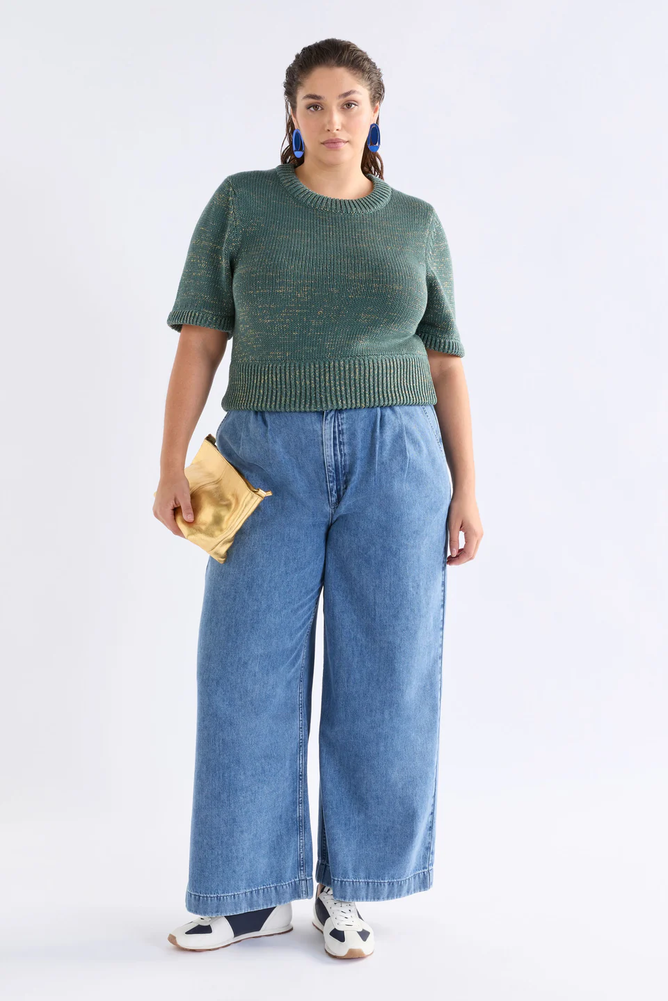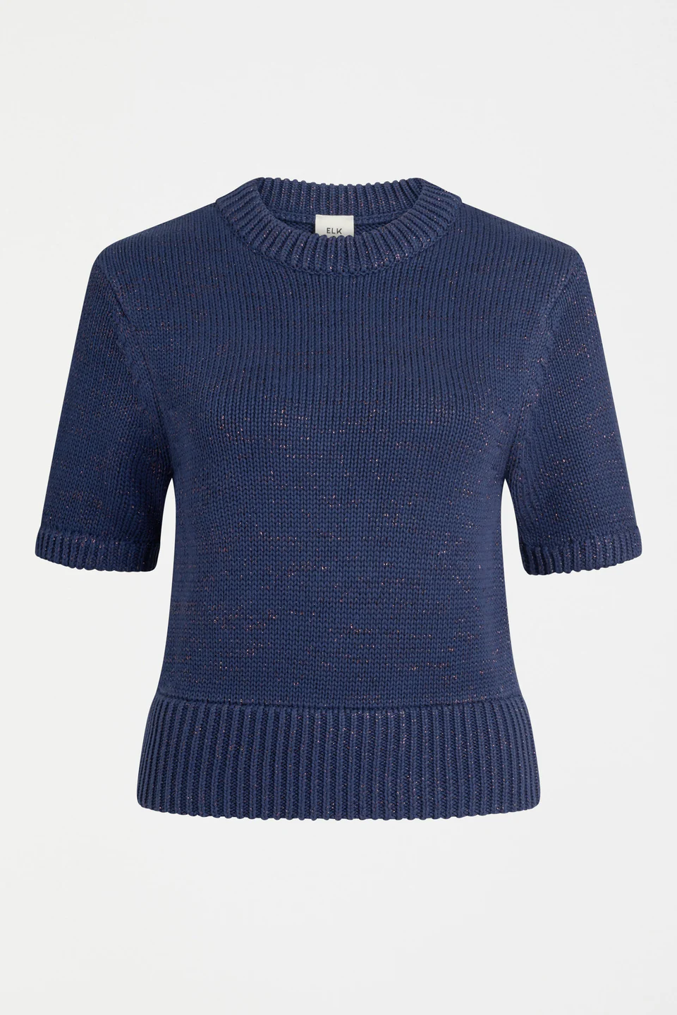 The ELK Luft Lurex Knit Top is a chunky knitted top in a soft organic cotton yarn with a fine metallic thread woven throughout, creating a gentle shimmer. This close fit, short sleeve sweater features a slightly cropped body length and double rib finish at the hem, neck, and sleeves. Its classic shape makes it a timeless wardrobe staple and the perfect warm layer to take you from every day and into the evenings, pair with high-waisted trousers for a playful, elevated look.