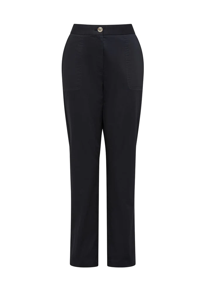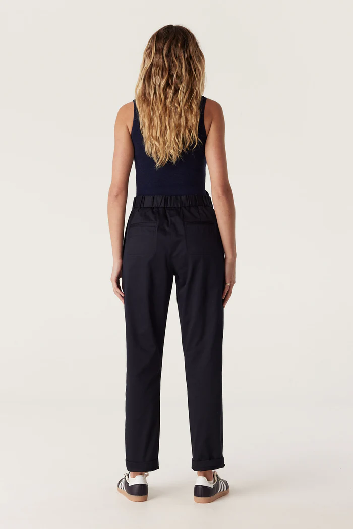 The Mari Pant in Navy by Cable Melbourne offers a regular fit, crafted from a woven stretch fabric for enhanced comfort. Featuring a fly front, elasticated back waist, and functional pockets, this versatile pant is perfect for effortless, everyday wear.