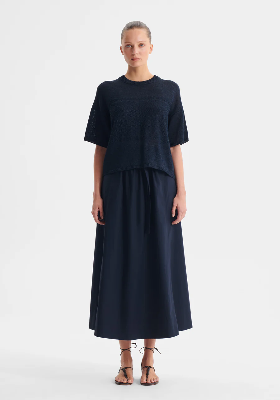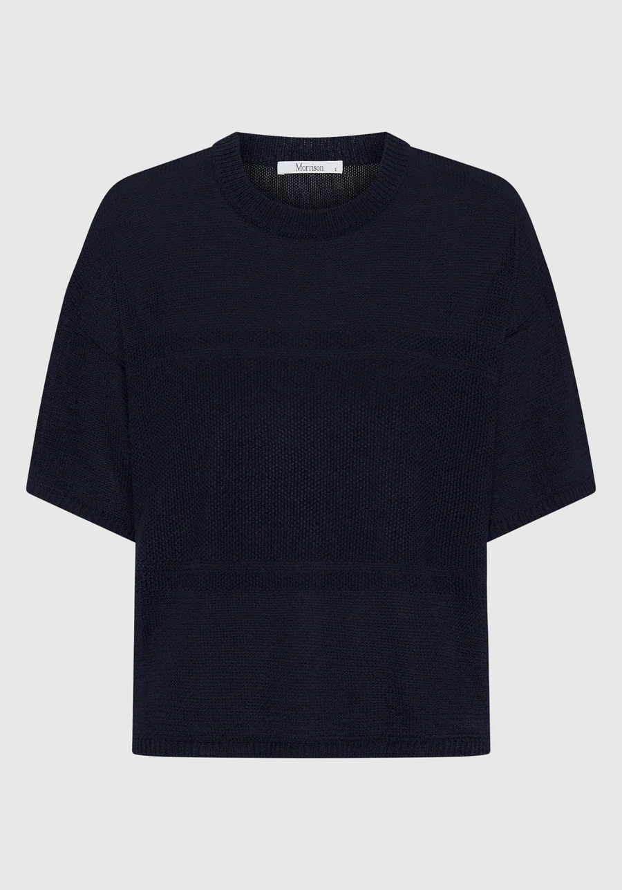 The Morrison Marli Knit Tee is made from a soft cotton-paper blend yarn, designed with a classic round neckline and short sleeves. Featuring contrast stitch panels and ribbed trims at the neckline, cuffs, and hem, it offers a modern boxy fit for effortless layering or standalone wear.