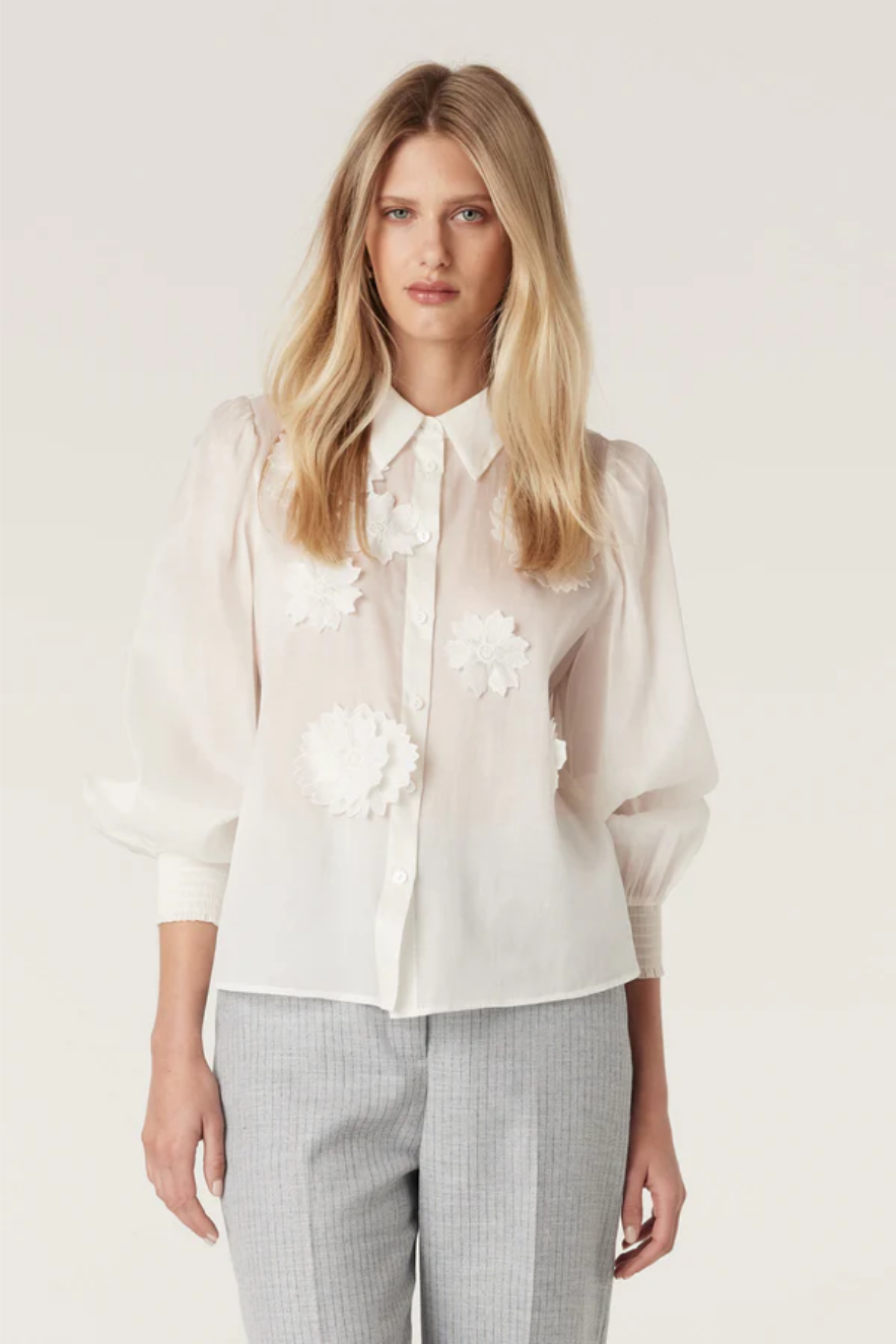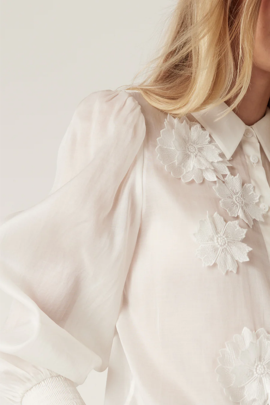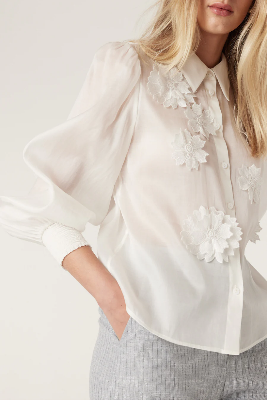 The Mirage Blouse by Cable Melbourne is an exclusive statement piece, designed from a lightweight and breathable silk cotton blend organza. With a relaxed fit, this blouse features delicate applique embroidered flower details, a button-through front, and long sleeves with shirred cuffs for a refined, feminine touch.
