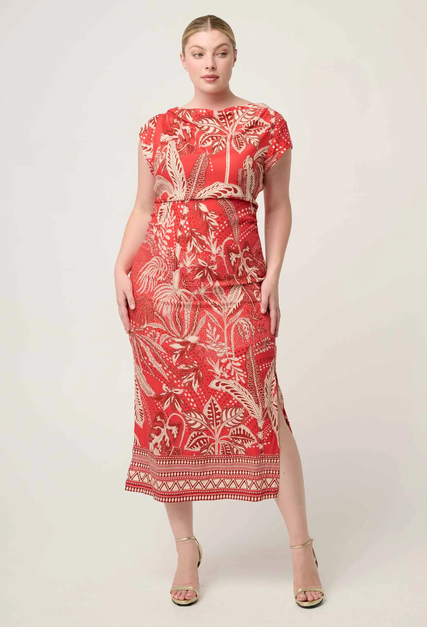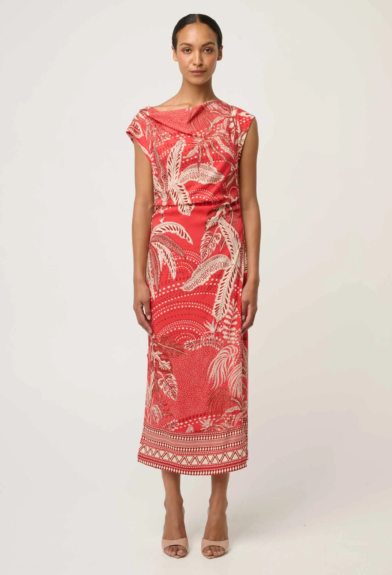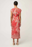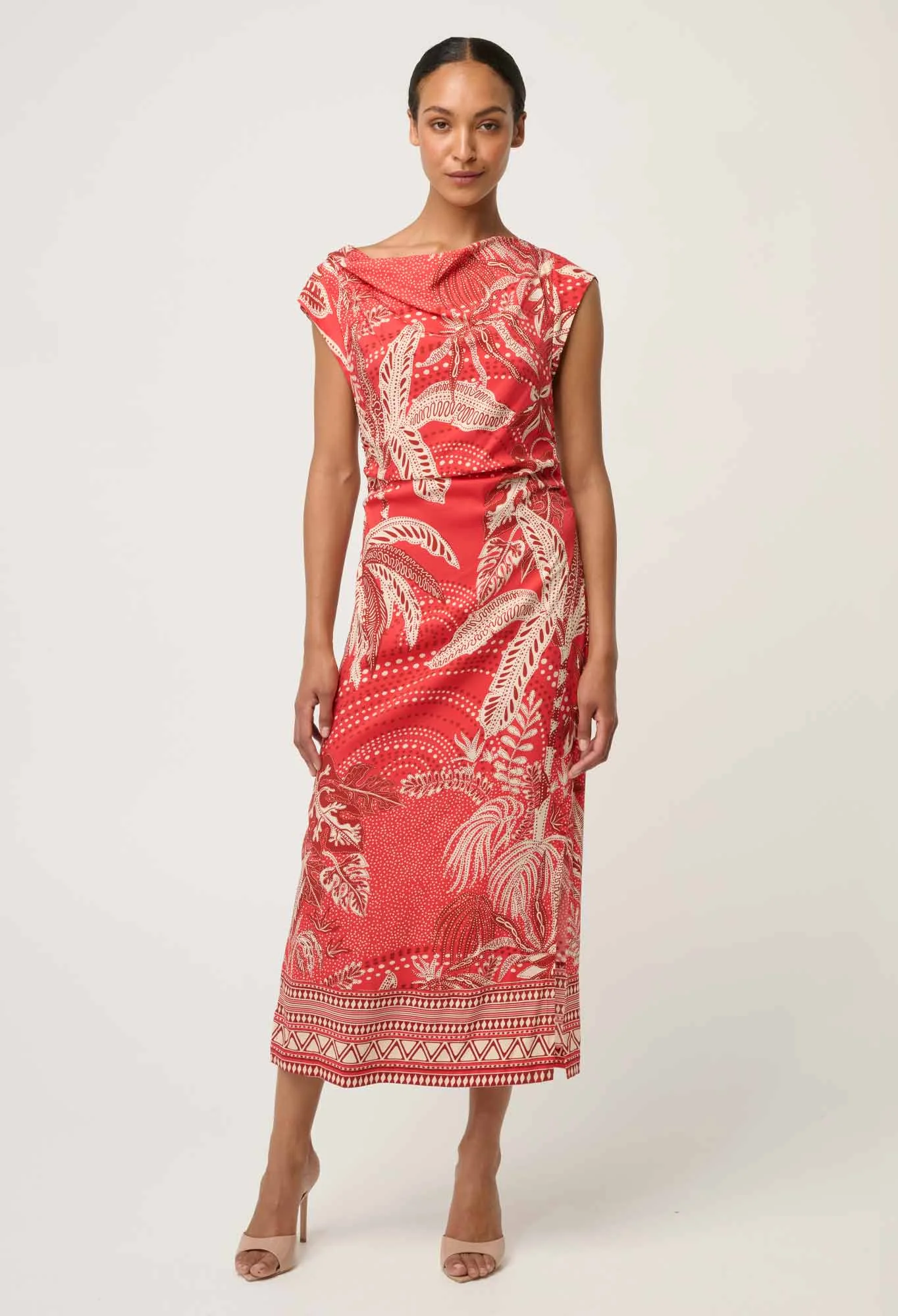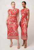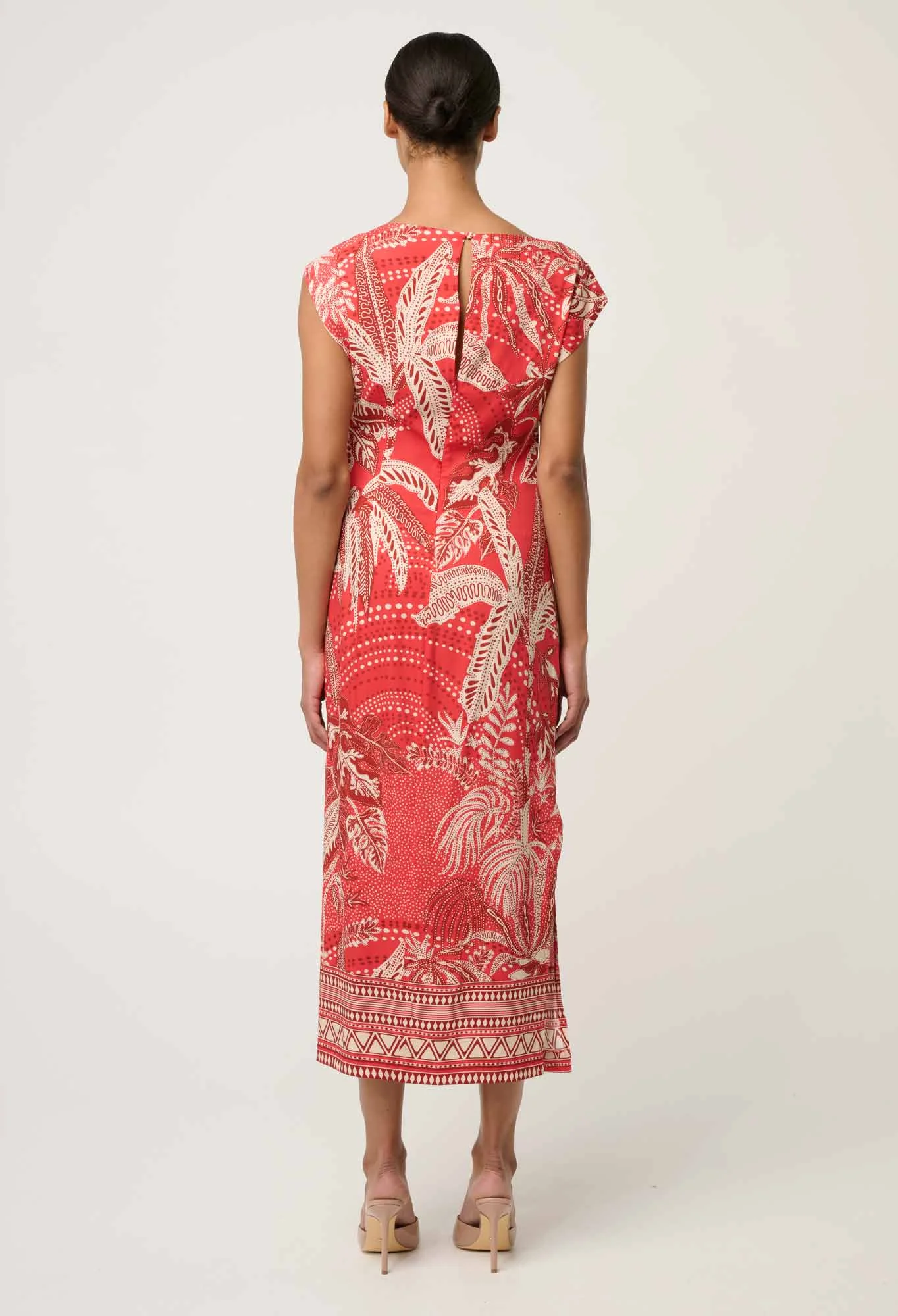 Showcasing the exclusive crimson palms print—an artful blend of tropical palm motifs and intricate detailing—this midi-length dress delivers statement style with timeless appeal. Cap sleeves balance the fitted shape, making it ideal for warm-weather events, cocktail occasions, and elevated evenings. Style with heels and understated jewellery for a polished, confident look.