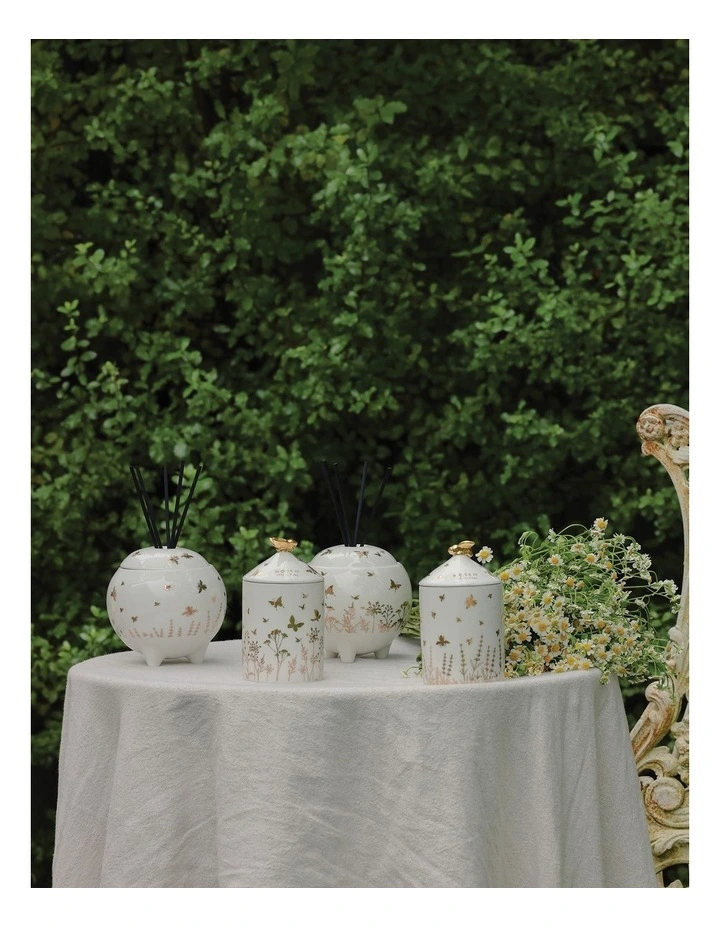 Top notes are bergamot and black tea, heart notes are red rose and jasmine, base notes are spiced orchid, soft vanilla and patchouli and presented in a limited edition ceramic vessel featuring intricate gold foiled details of bees dancing in the garden.