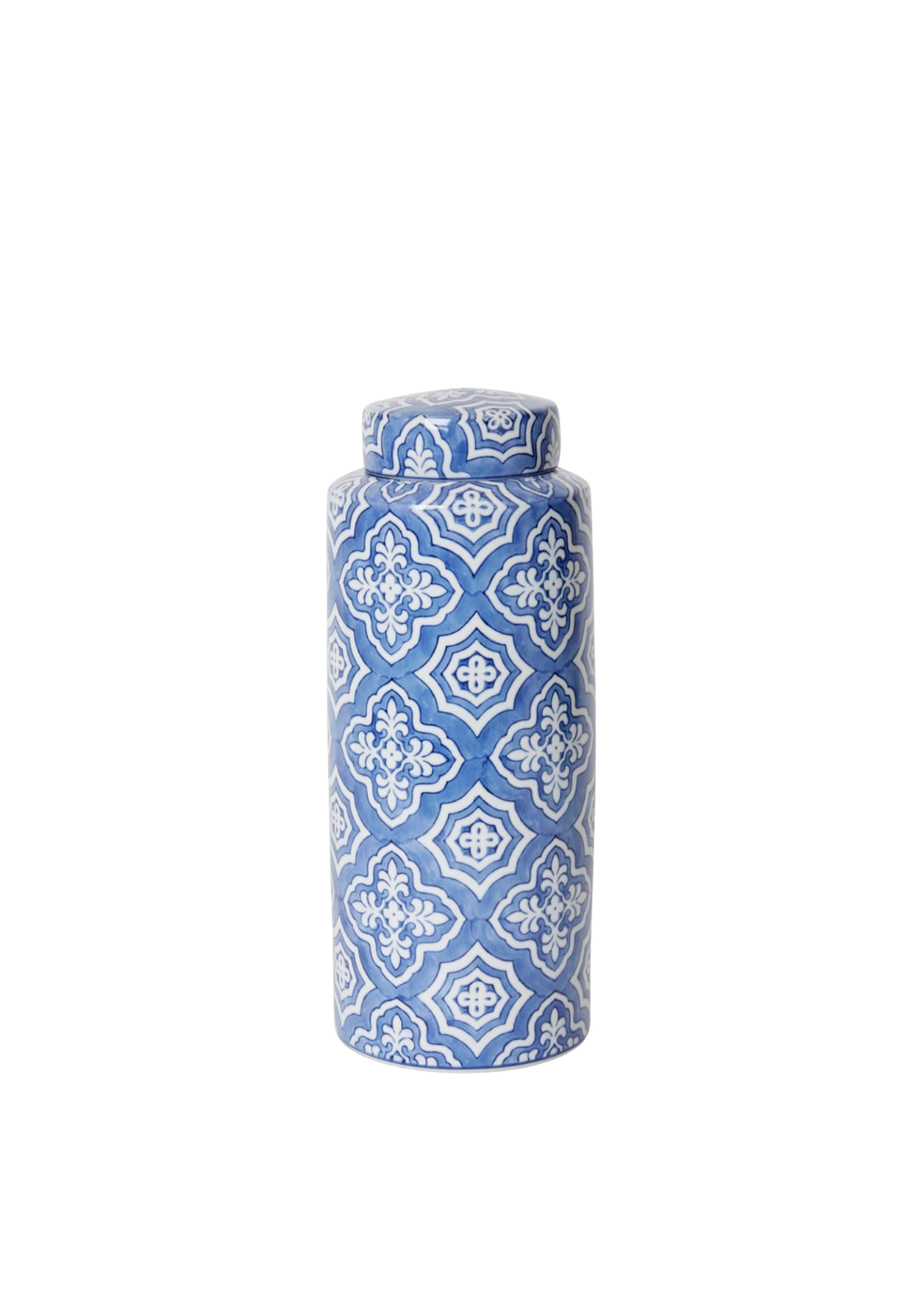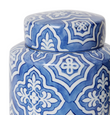The Elme Munni Jar is a timeless decorative piece, featuring an elegant blue and cream chinoiserie pattern on fine porcelain.