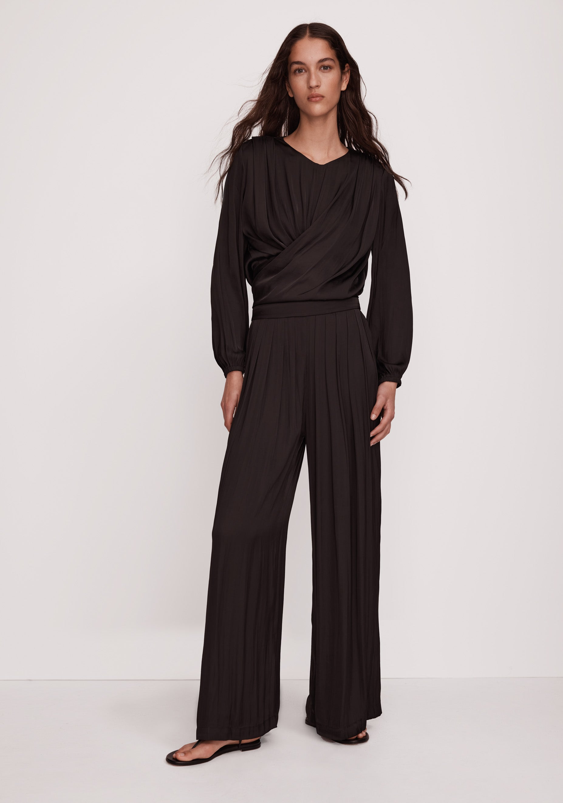These pants feature a high waistband for a flattering silhouette and an invisible zip at the back for a seamless look. The tucks from the front waistband add subtle detail while the wide leg design exudes sophistication, finishing in a full-length cut for a versatile and elegant wardrobe staple.
