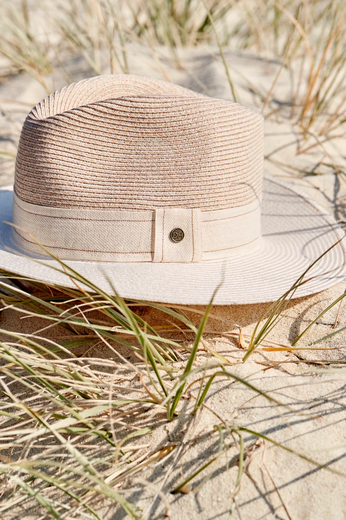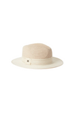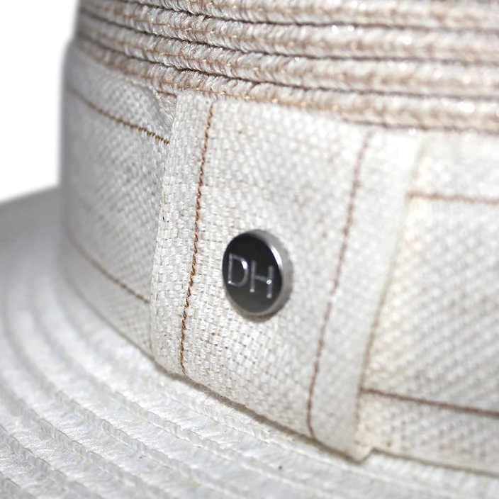 Featuring a natural brim and ivory crown with a 4cm wide linen ribbon trim. This trim has been custom border-stitched in taupe reflecting the hand-stitched edge of the brim.