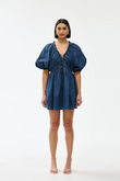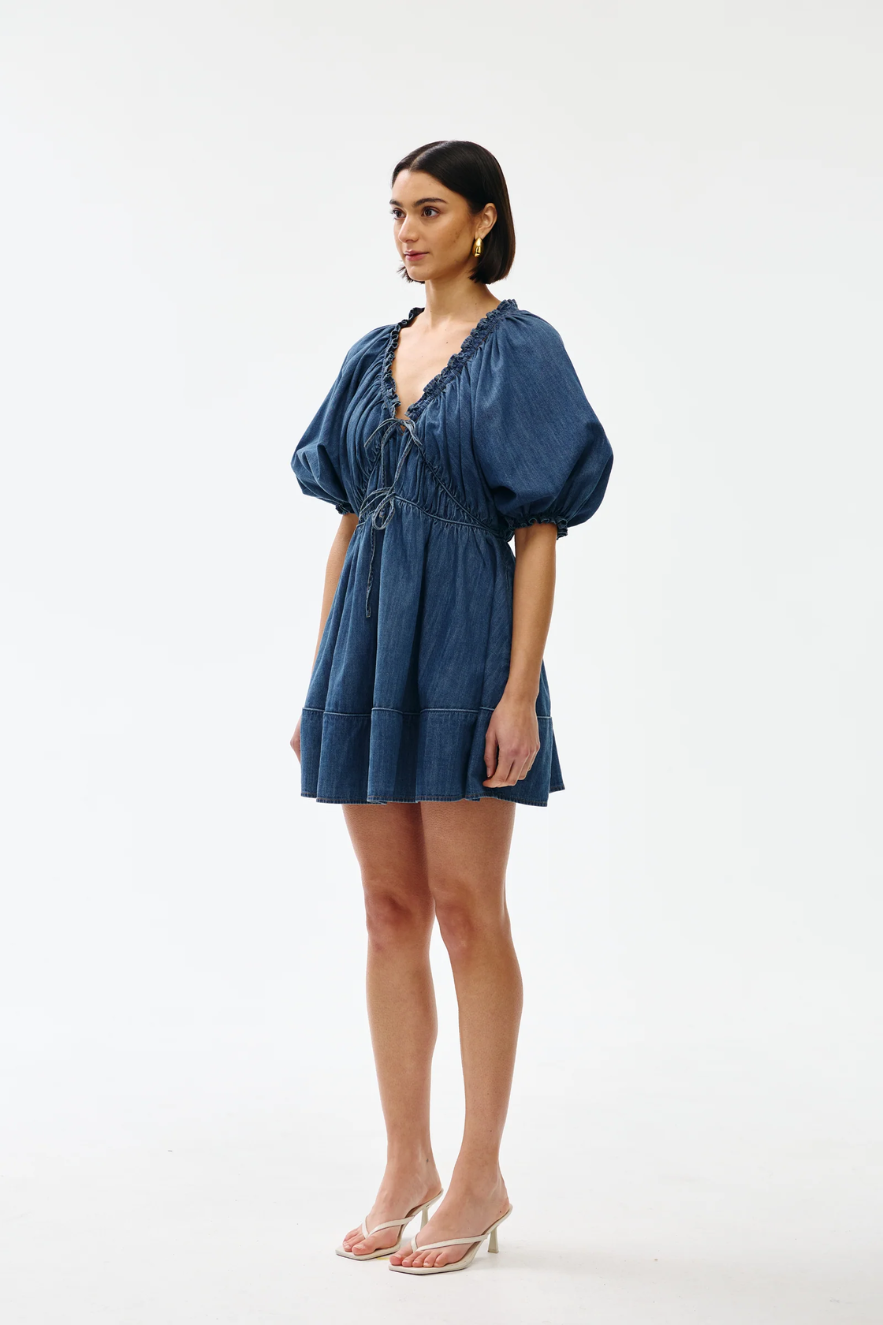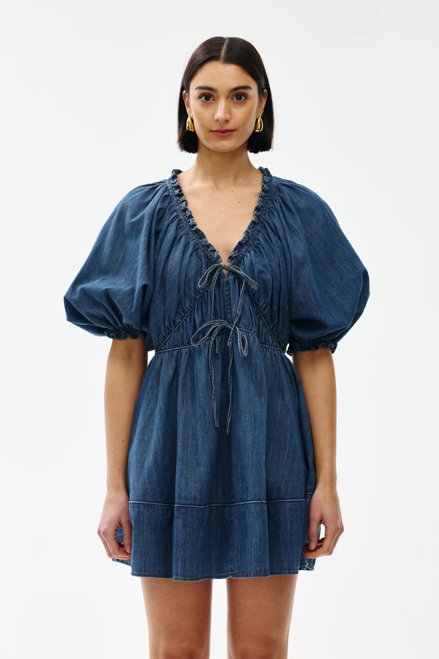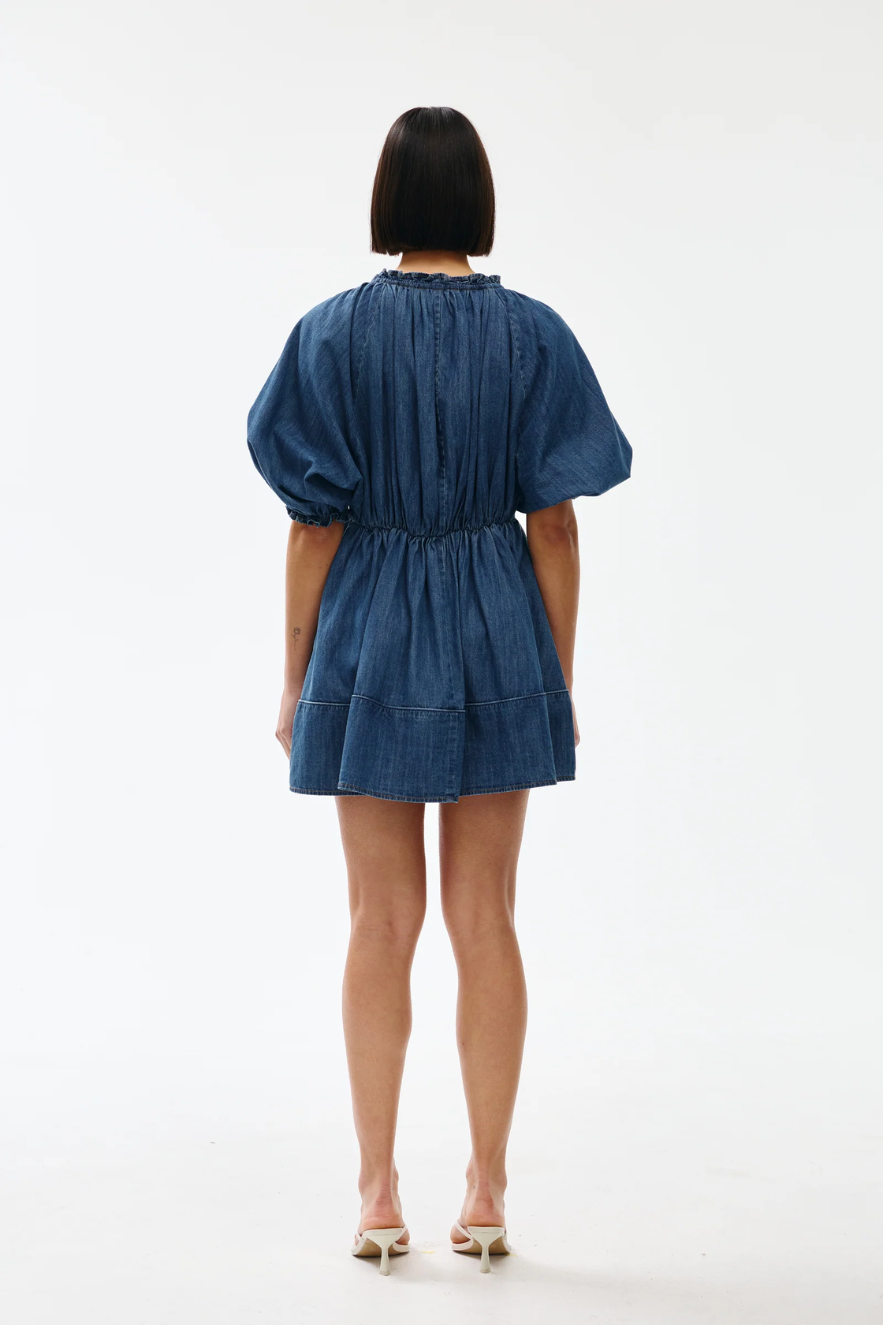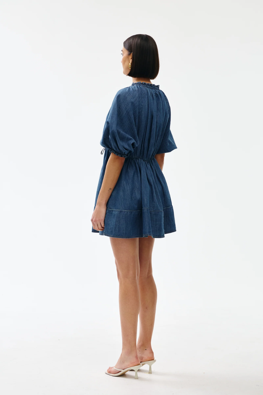 The Pia Mini Dress Denim by Kinney is the ultimate summer party dress, designed with voluminous sleeves and elevated detailing including gathering, piping, ruffles, and ties. Crafted from mid-weight cotton denim, this dress offers a floaty, oversized silhouette that is both flattering and bump-friendly, making it perfect for every occasion.