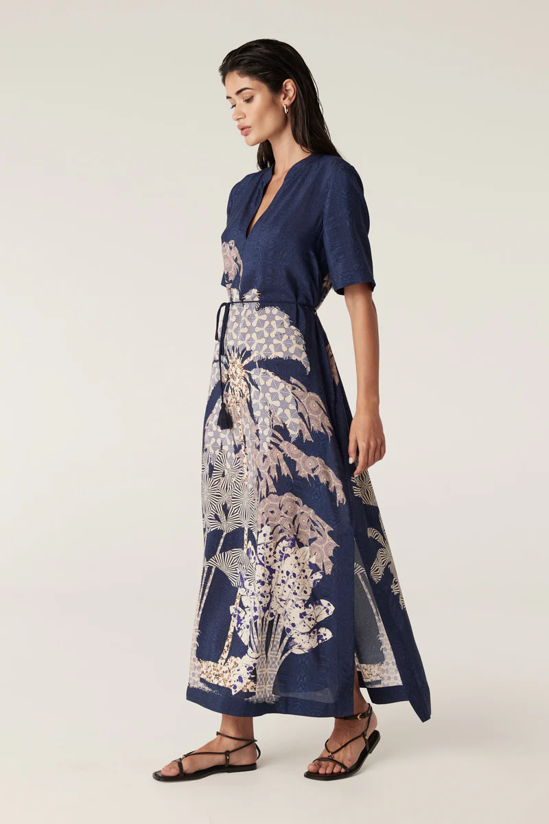 The Pina Kaftan Dress from Cable Melbourne features a relaxed fit with a stand collar and side splits. Made from a lightweight and breathable silk blend with an exclusive print. This kaftan includes a removable waist tie with tassel detail for versatile styling.