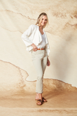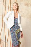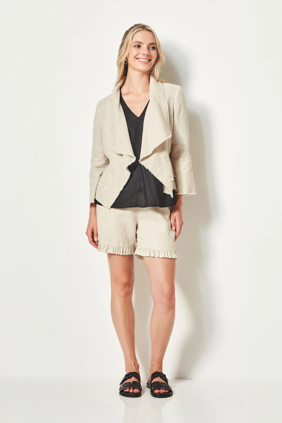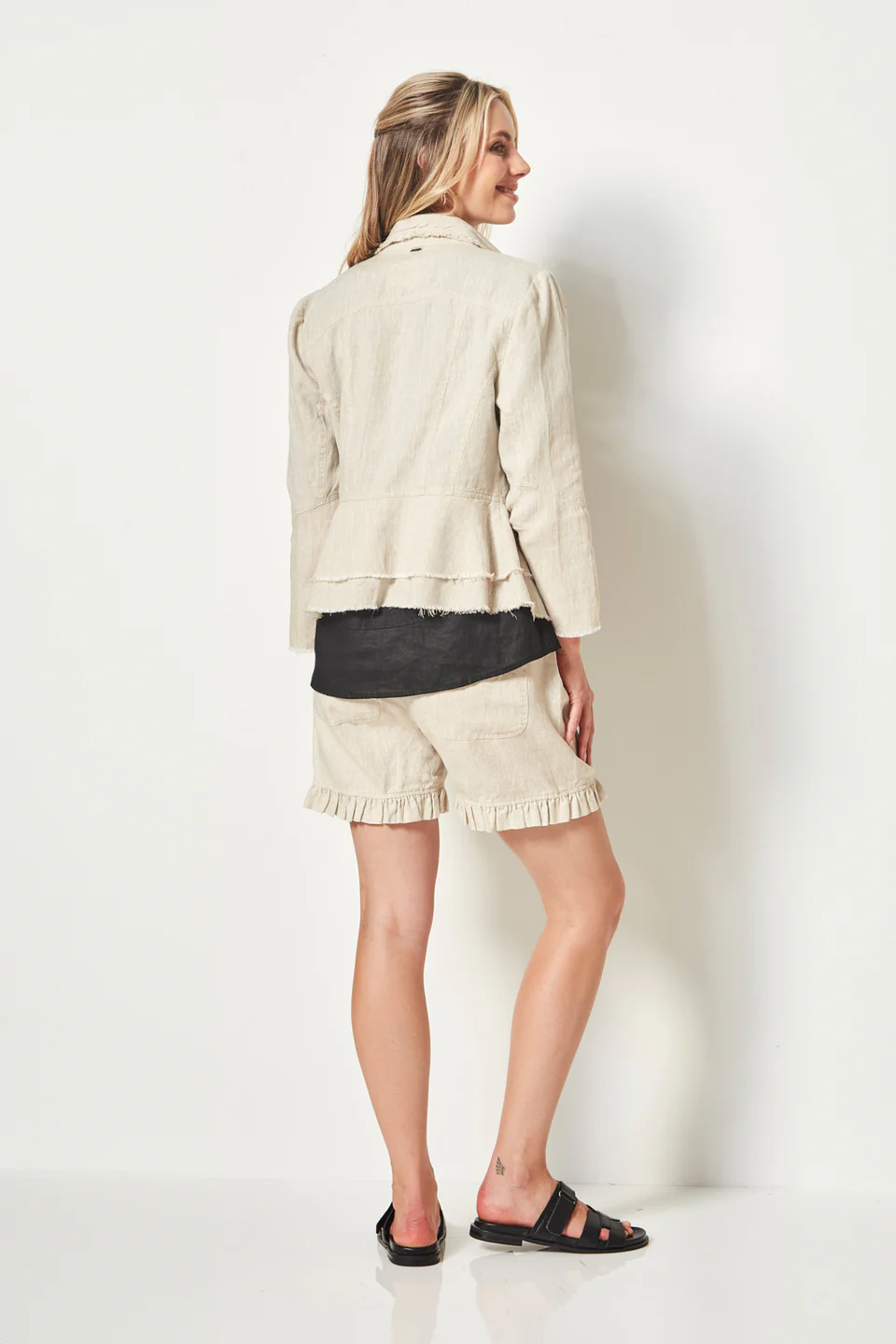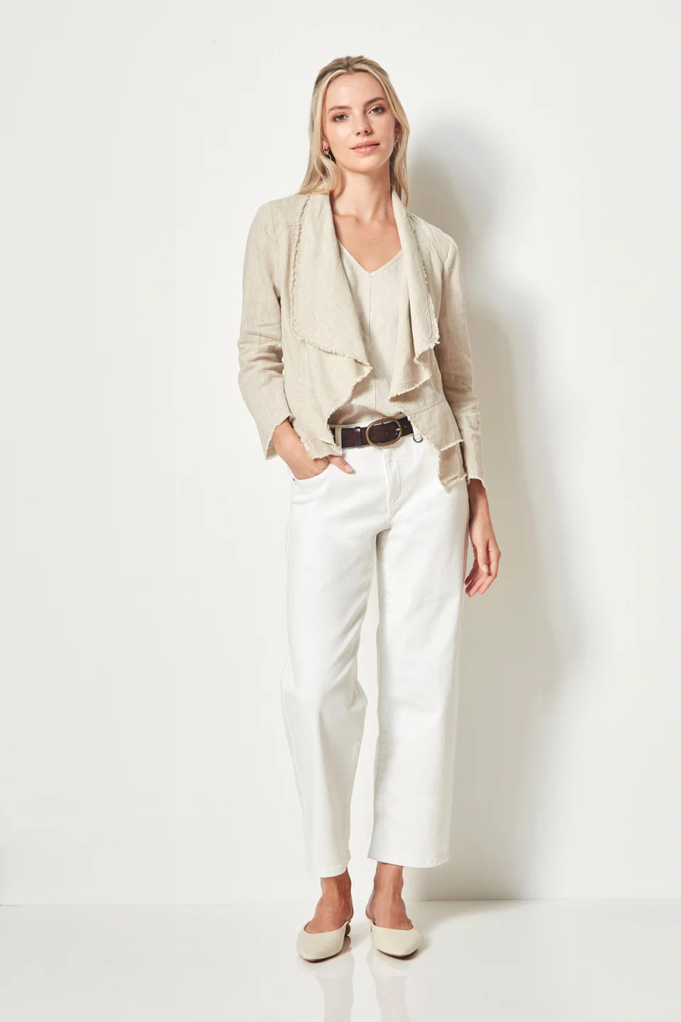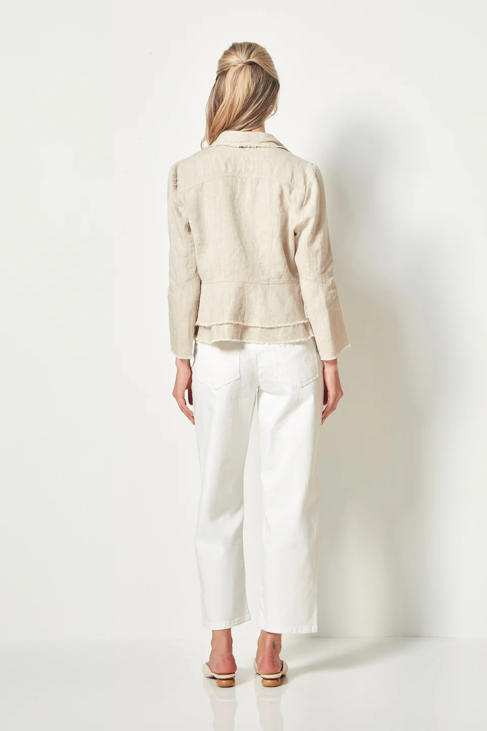 The Verge Proof Jacket is a 100% linen piece featuring a chic shawl collar and a flattering, fitted waist with a double peplum detail. Its bracelet-length sleeves flare elegantly from the elbow, adding a touch of sophistication. Designed to fall at the hip, this jacket offers a refined yet versatile style for any occasion.