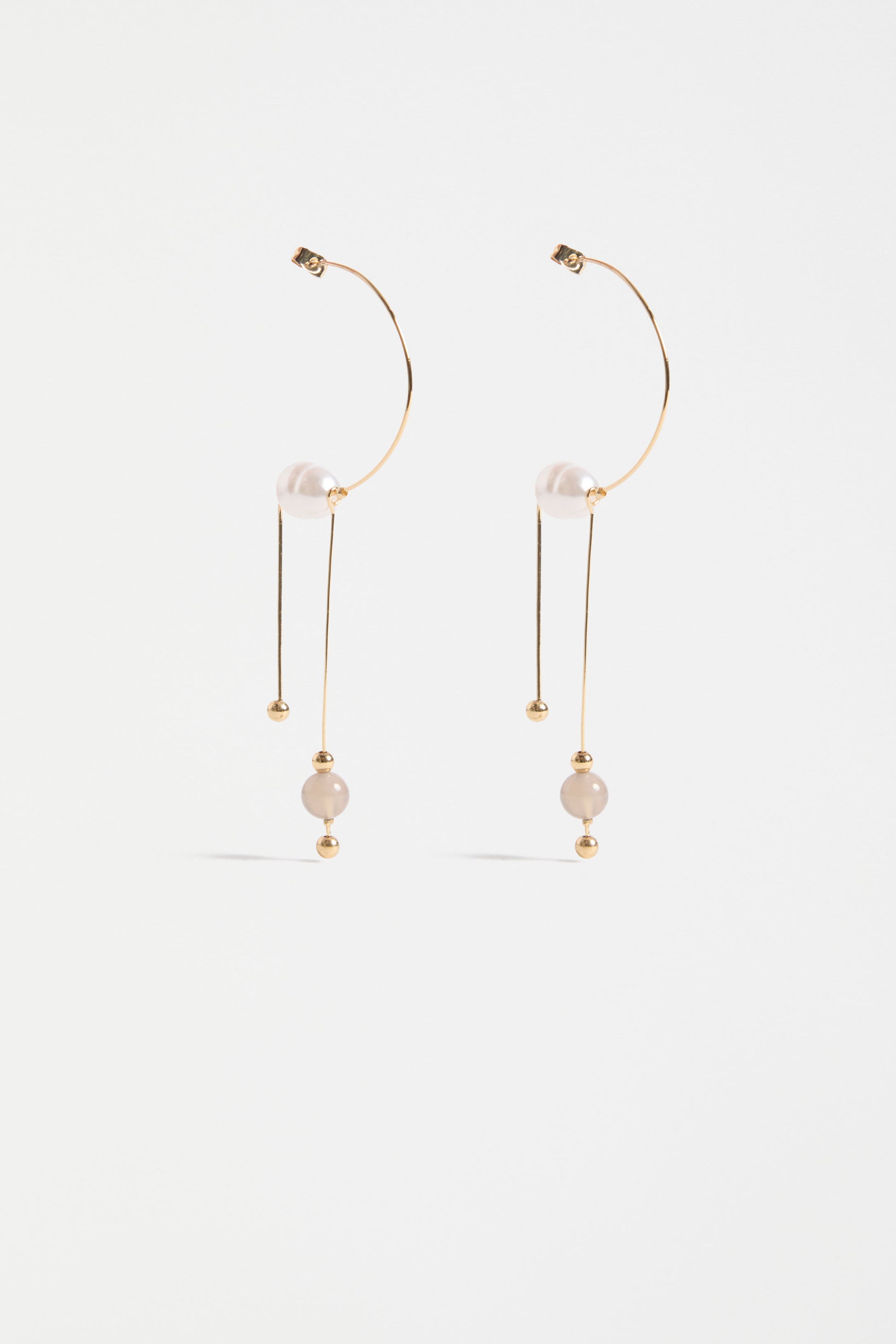 Sleek and sculptural, the ELK Pykka Drop Earring blends minimalism with subtle movement. Featuring an open-ended hoop with elongated stems that dance below the ear, each pair is finished with a mix of faux pearl and glass beads for a refined, modern edge.