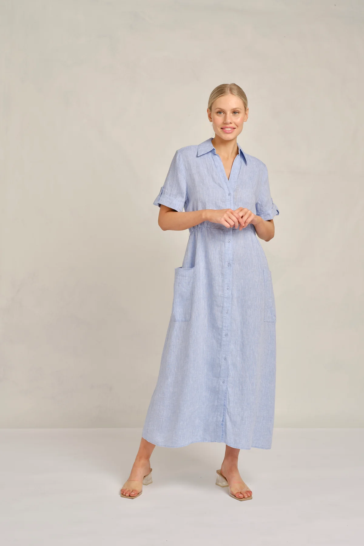 Made from 100% linen, this long dress features short sleeves with cuff tabs, an elasticated waist with belt loops, and side patch