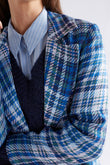 The longer line fit and thin shoulder pads offer a bold structured silhouette.